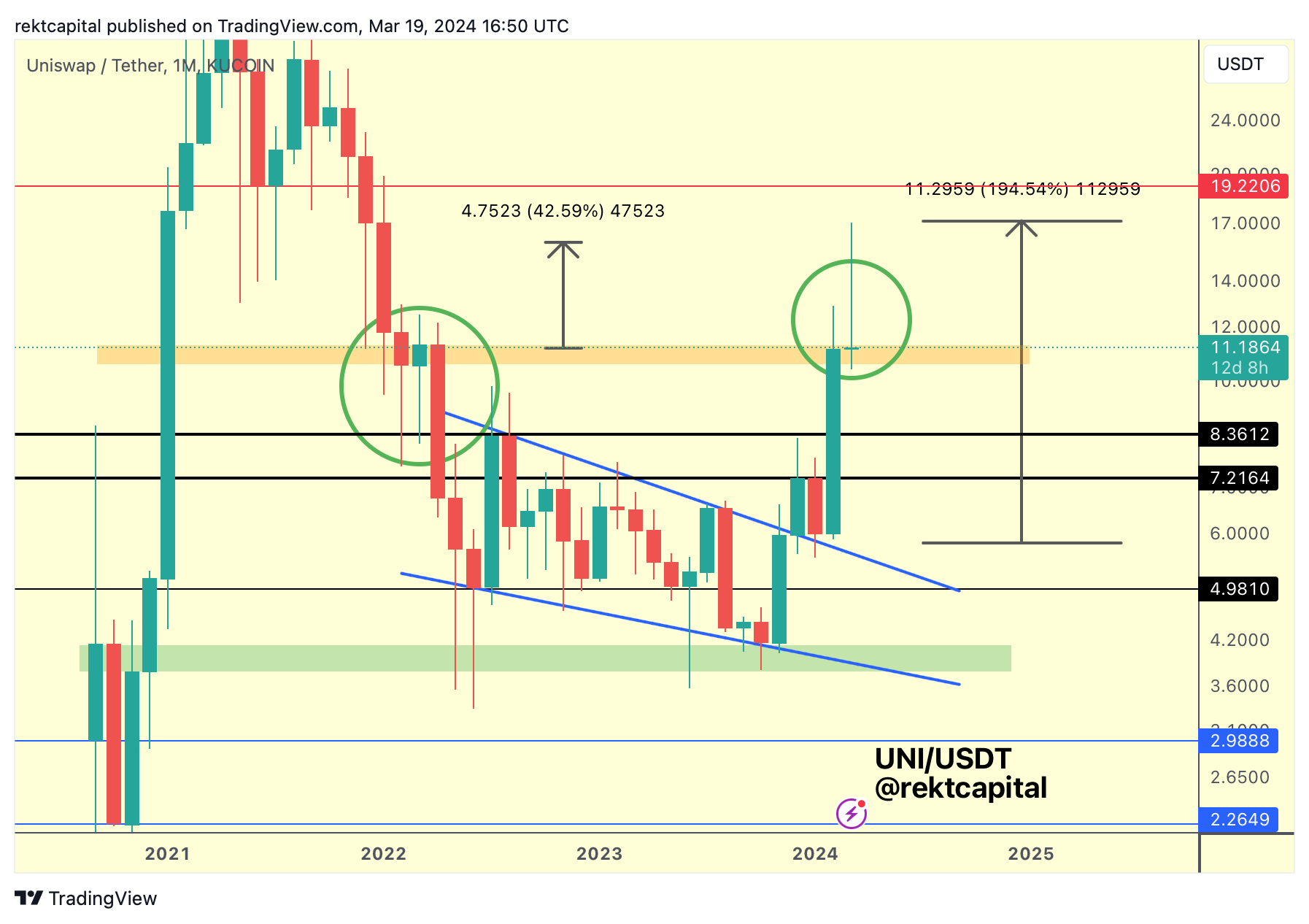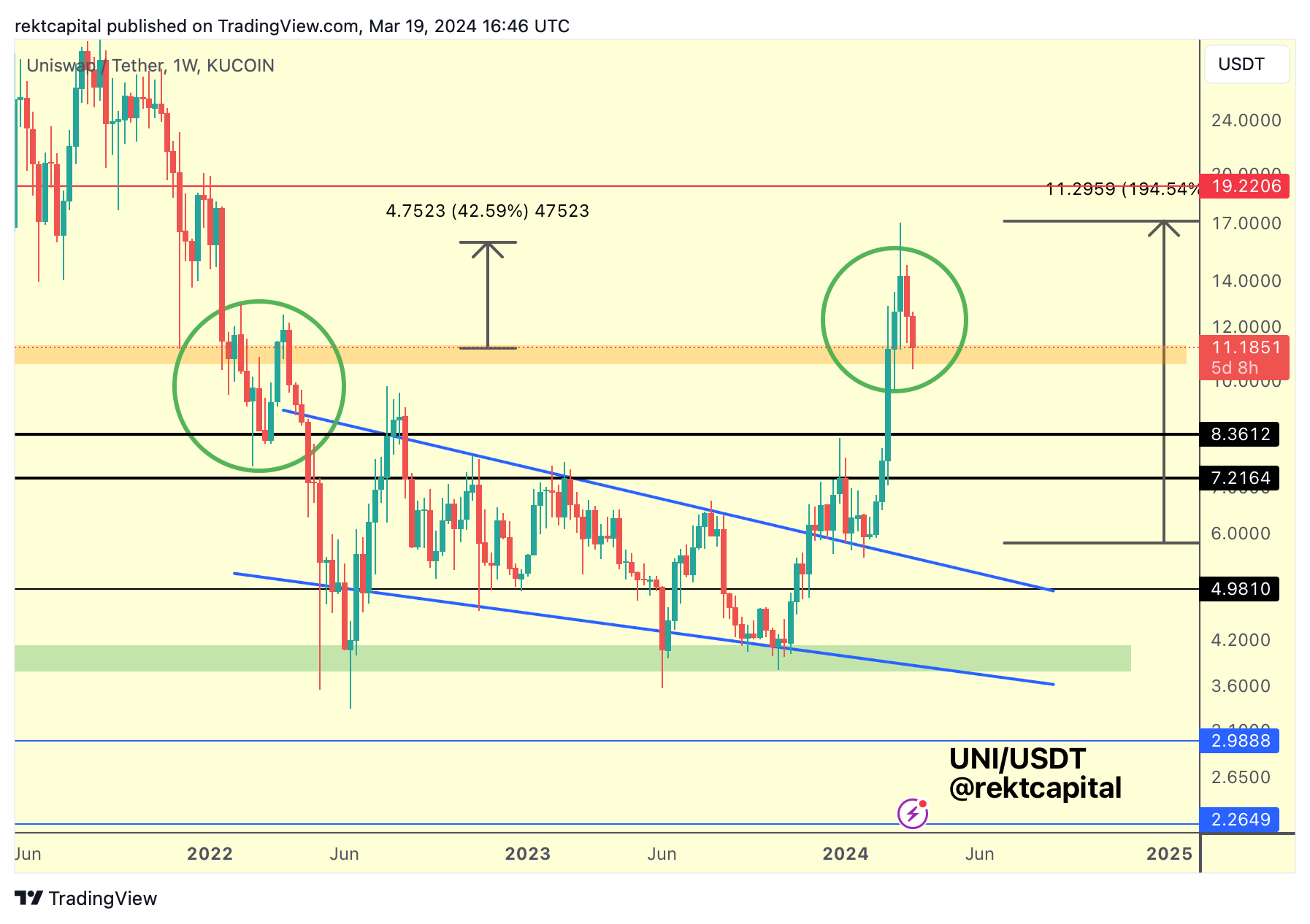 In early 2022, the green circle showcases how this region figured as a point of rejection whereas this current green circle is to demonstrate how this same price area can flip into a base from which UNI could be able to springboard from in the future.