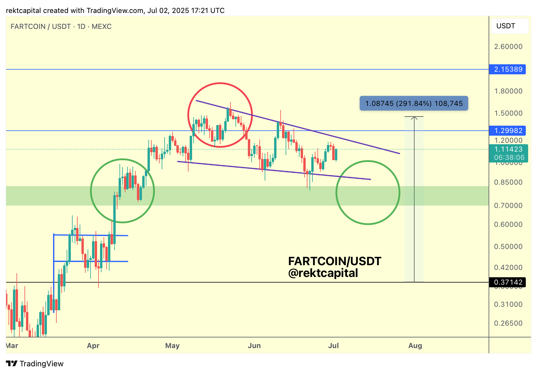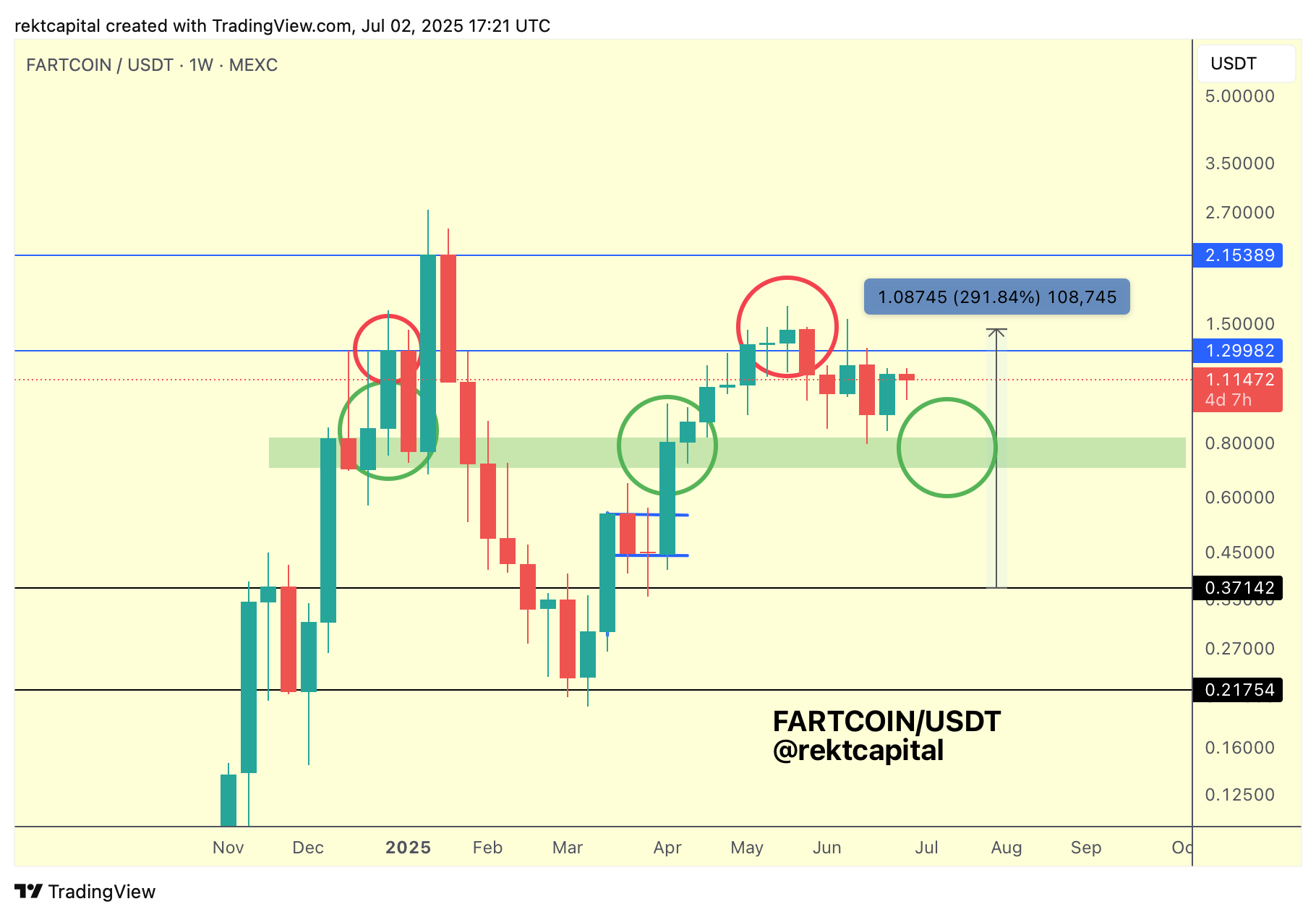 FARTCOIN has been consolidating inside its green-blue range since failing its breakout retest a few months back (red circle).