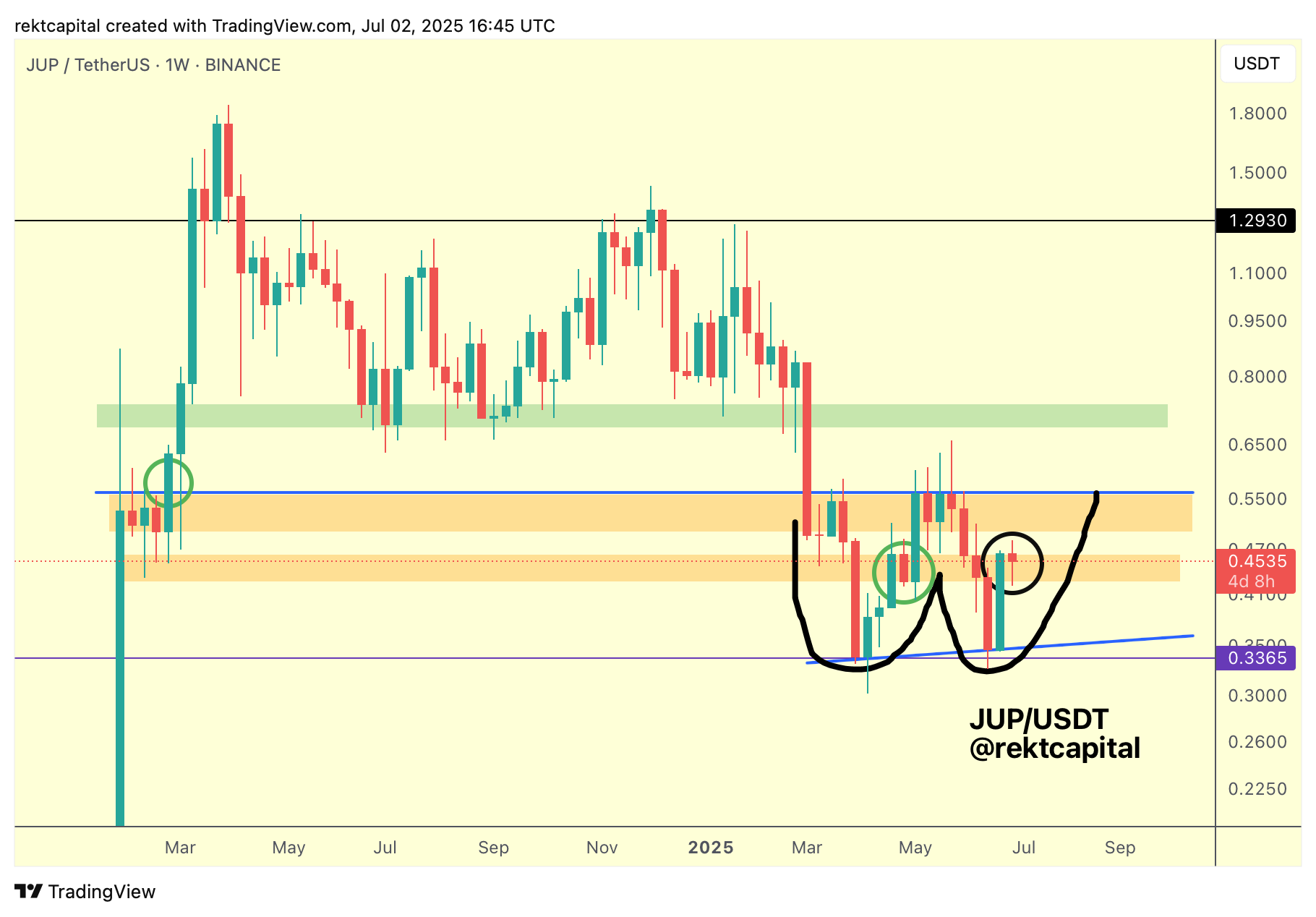 More, retesting the local orange area would see JUP continue to develop a potential Double Bottom formation here (black):