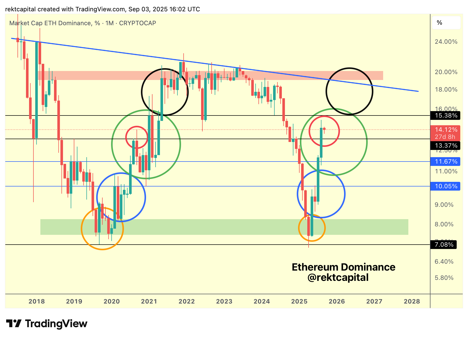 Holding above 13.37% will be quite important as that would signal strength at the 13.37% support which would increase the chances of breaking 15.4% in the future for what would be the final phase in the ETH Dominance cycle (black circle).