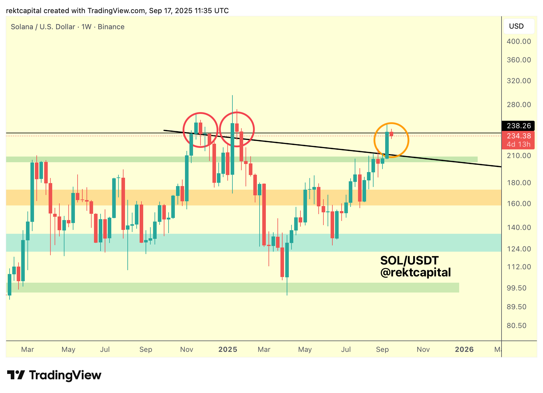 Whether SOL can hold $230–$238 as support across consecutive Weekly Closes, or whether it dips into the trendline first, will define the next major move: