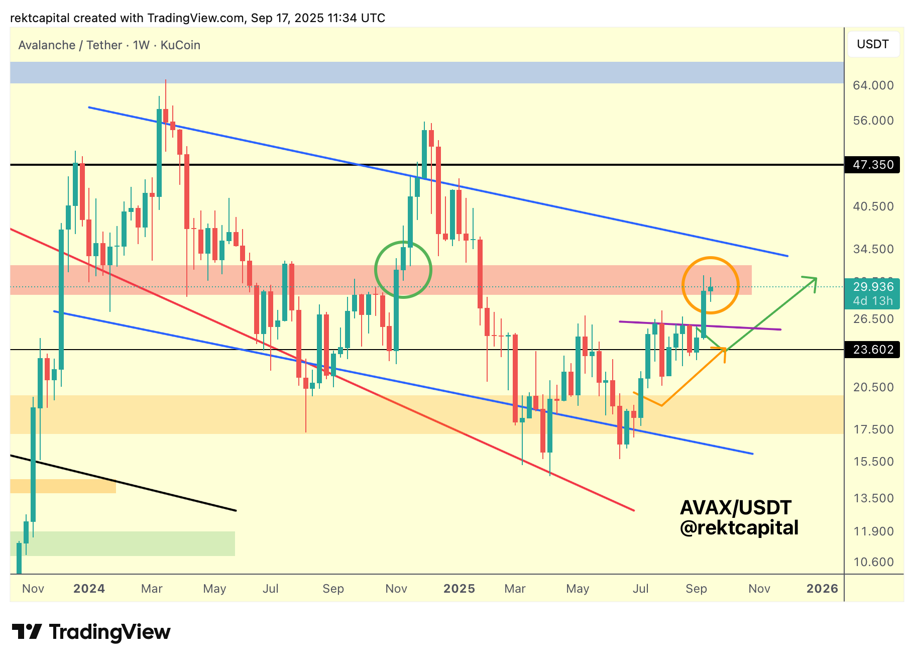 AVAX has been trading inside the blue macro wedge for a long time, oscillating steadily from top to bottom in this downtrending channel.