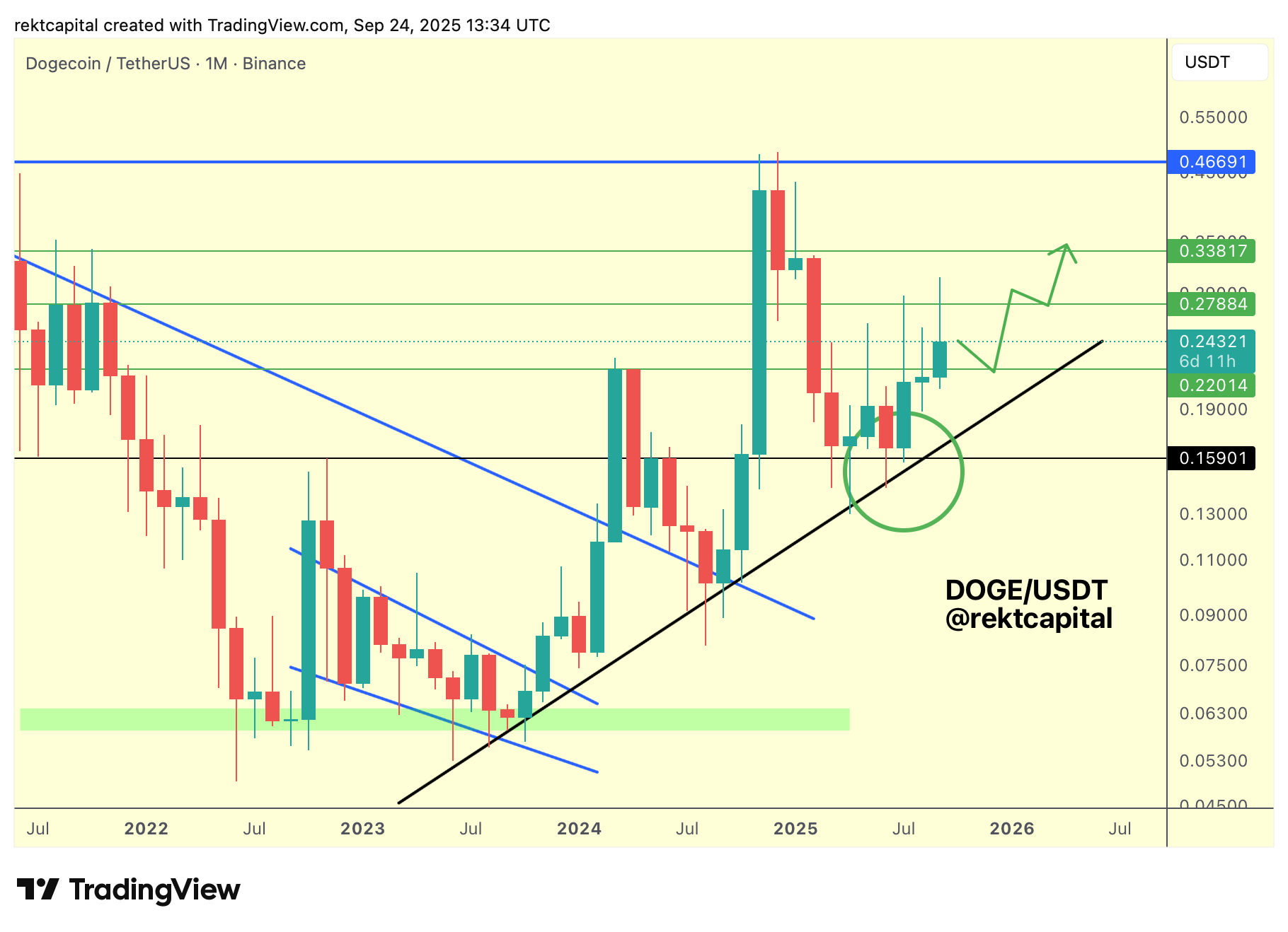 Dogecoin’s pre-halving highs at $0.22 (green line) have flipped into new support.