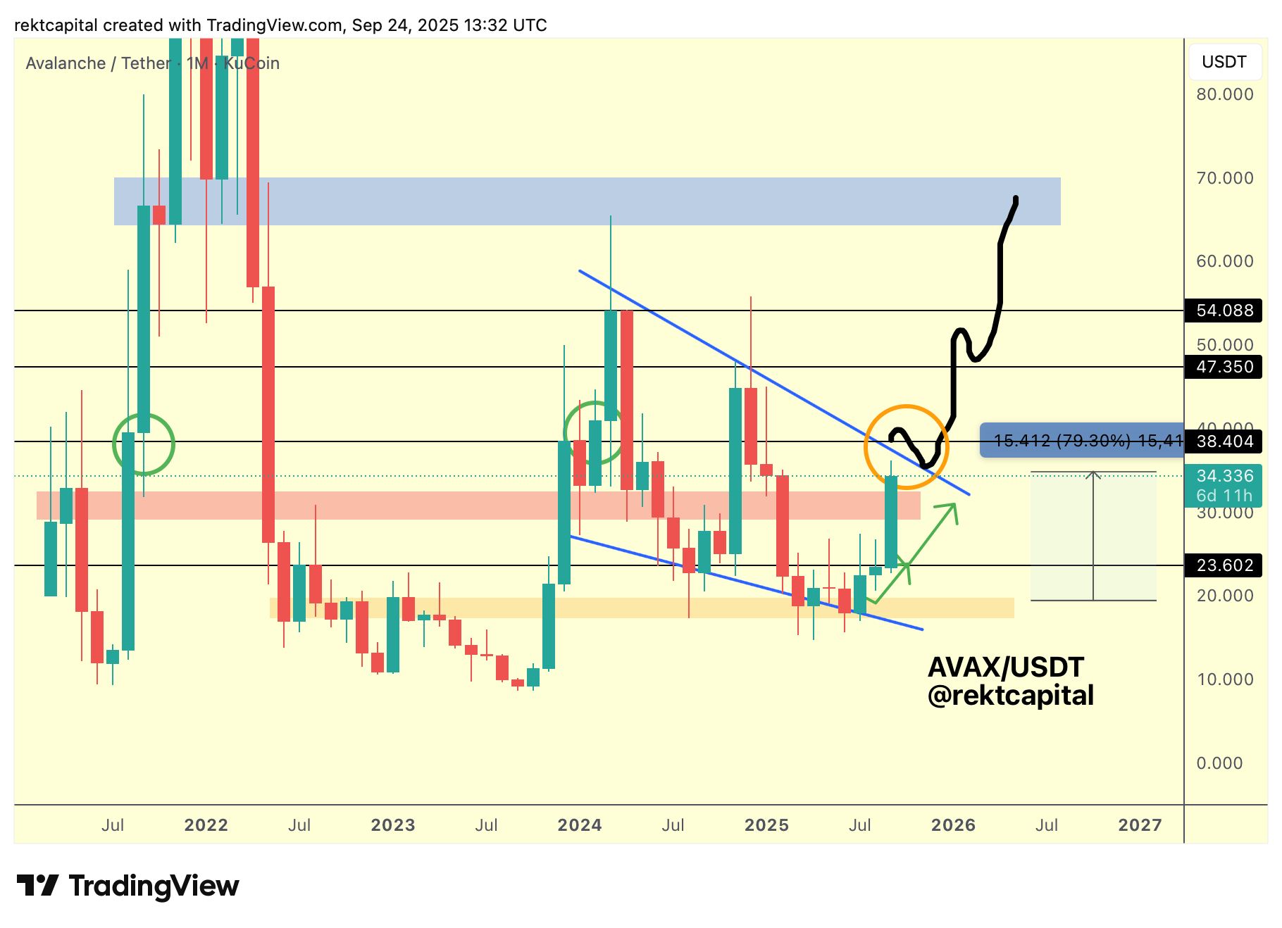 If AVAX fails to secure that Monthly Close above $38.40, there remains scope for re-accumulation inside the red region. A retest there could extend base-building further into Q4, ultimately enabling a more sustainable breakout attempt later.