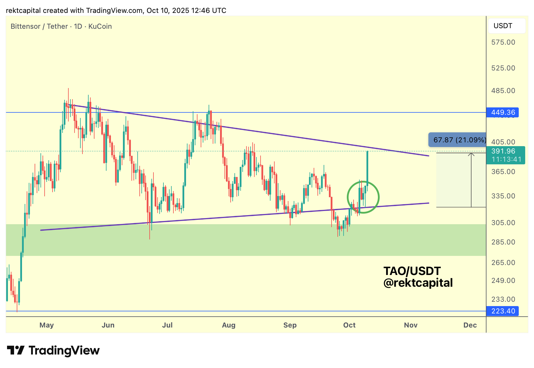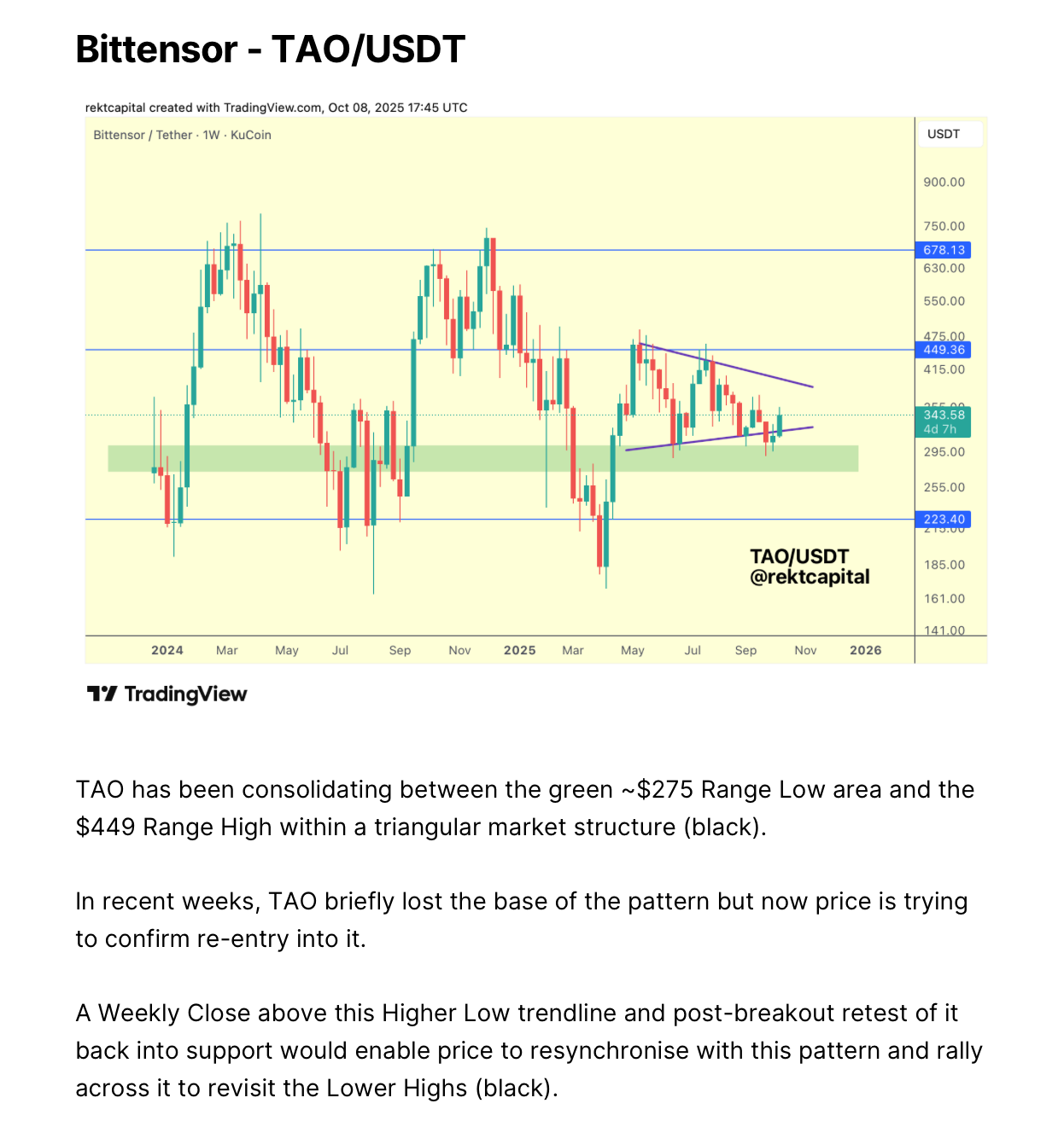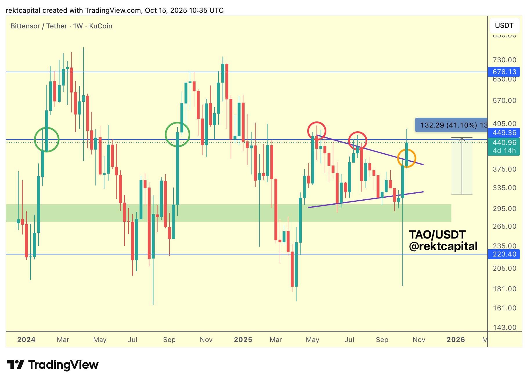 If TAO Weekly Closes above the diagonal but remains below $449 (blue), a post-breakout retest of that diagonal could occur before further upside.