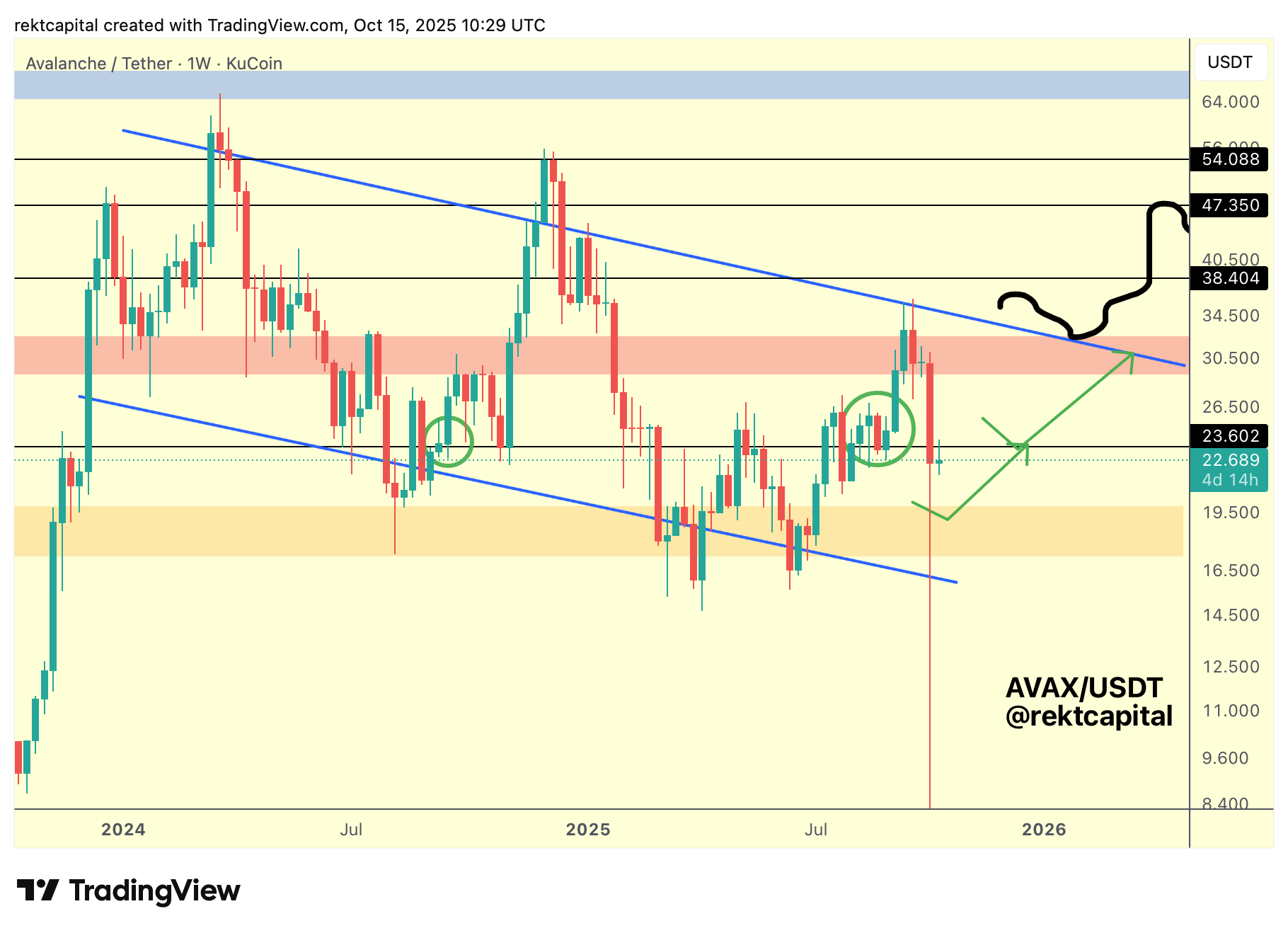 Similar deviations and recoveries occurred during the summer months (green circles), where Avalanche successfully reclaimed $23.60 after short-lived breakdowns.