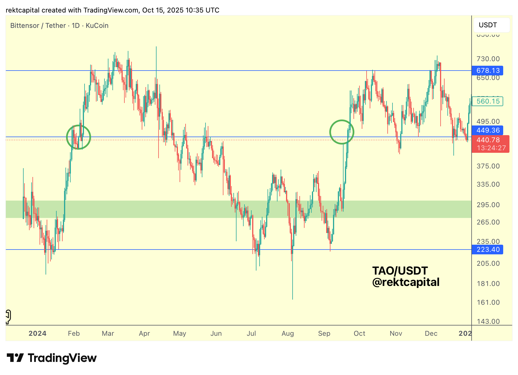 However, if TAO Weekly Closes above $449, that would position price to re-enter its Macro Range between $449 and $678 (blue). The same range that defined prior expansion phases.