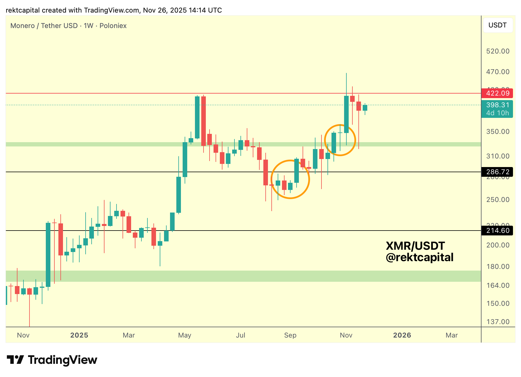 If resistance continues to hold, XMR is likely to revisit support, with a risk that repeated testing weakens that level and limits future upside generated from it.