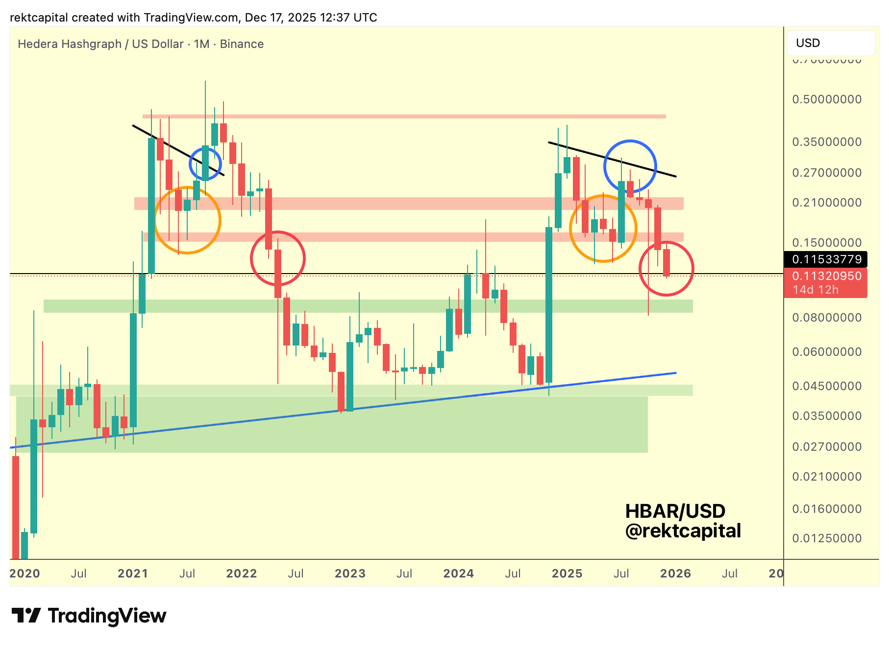 HBAR has now Monthly Closed below the red region, turning it into resistance, which aligns with the early stages of the 2022 distribution sequence.