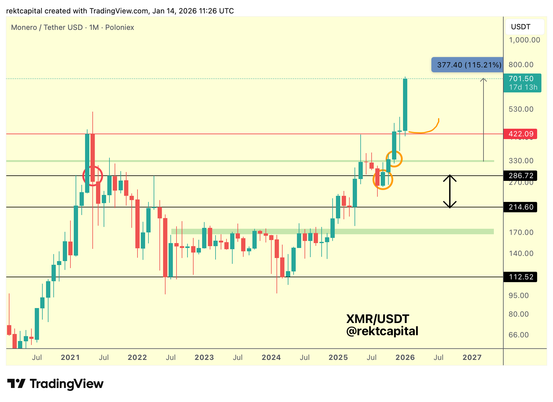 That process has now enabled a breakout into Price Discovery, carrying XMR into new All Time Highs and confirming that the higher-timeframe structure has shifted constructively.
