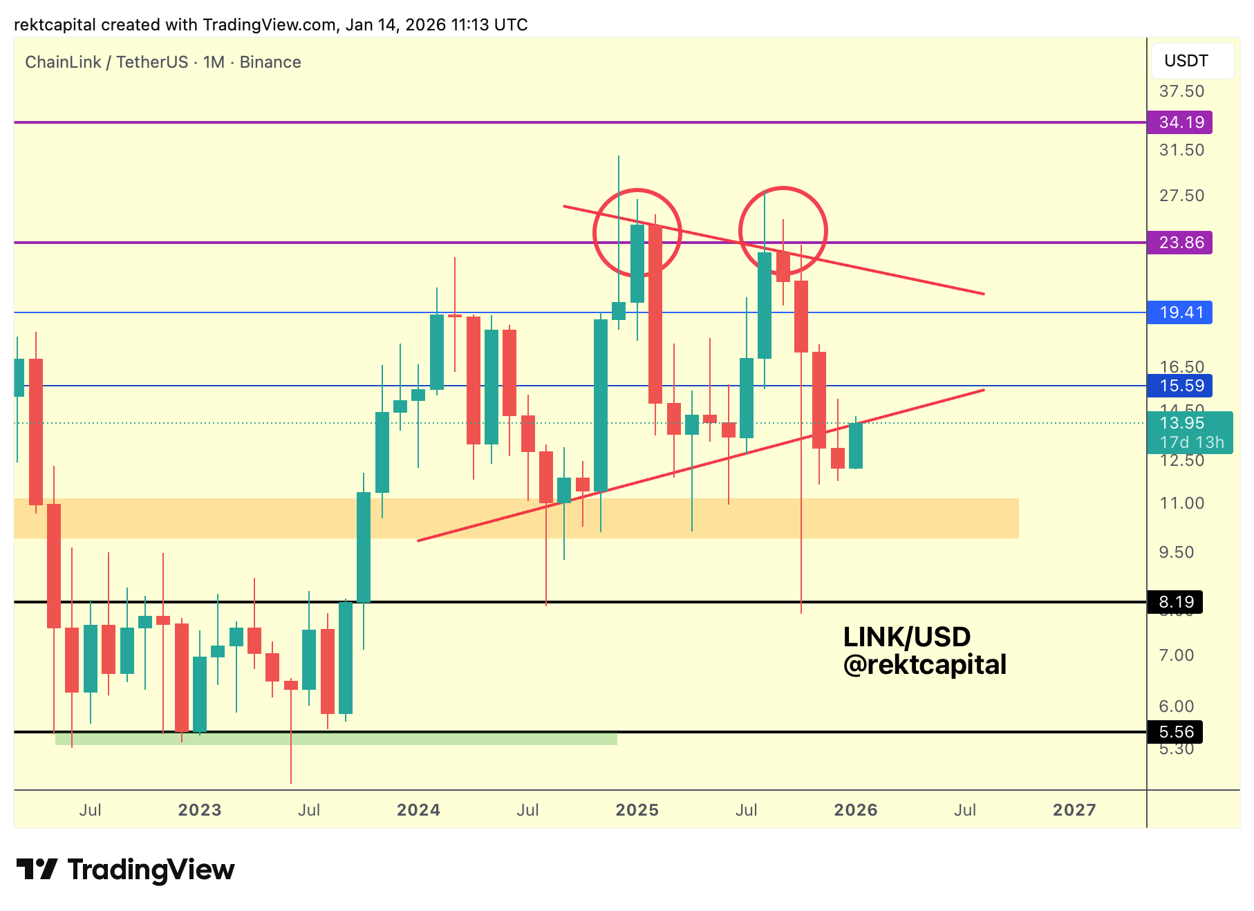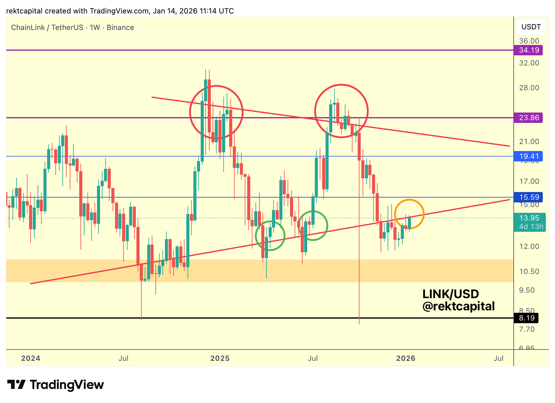 On the higher timeframe, Chainlink continues to trade within a broader macro triangle, a structure that has historically allowed for sizable internal moves without immediately resolving directionally.