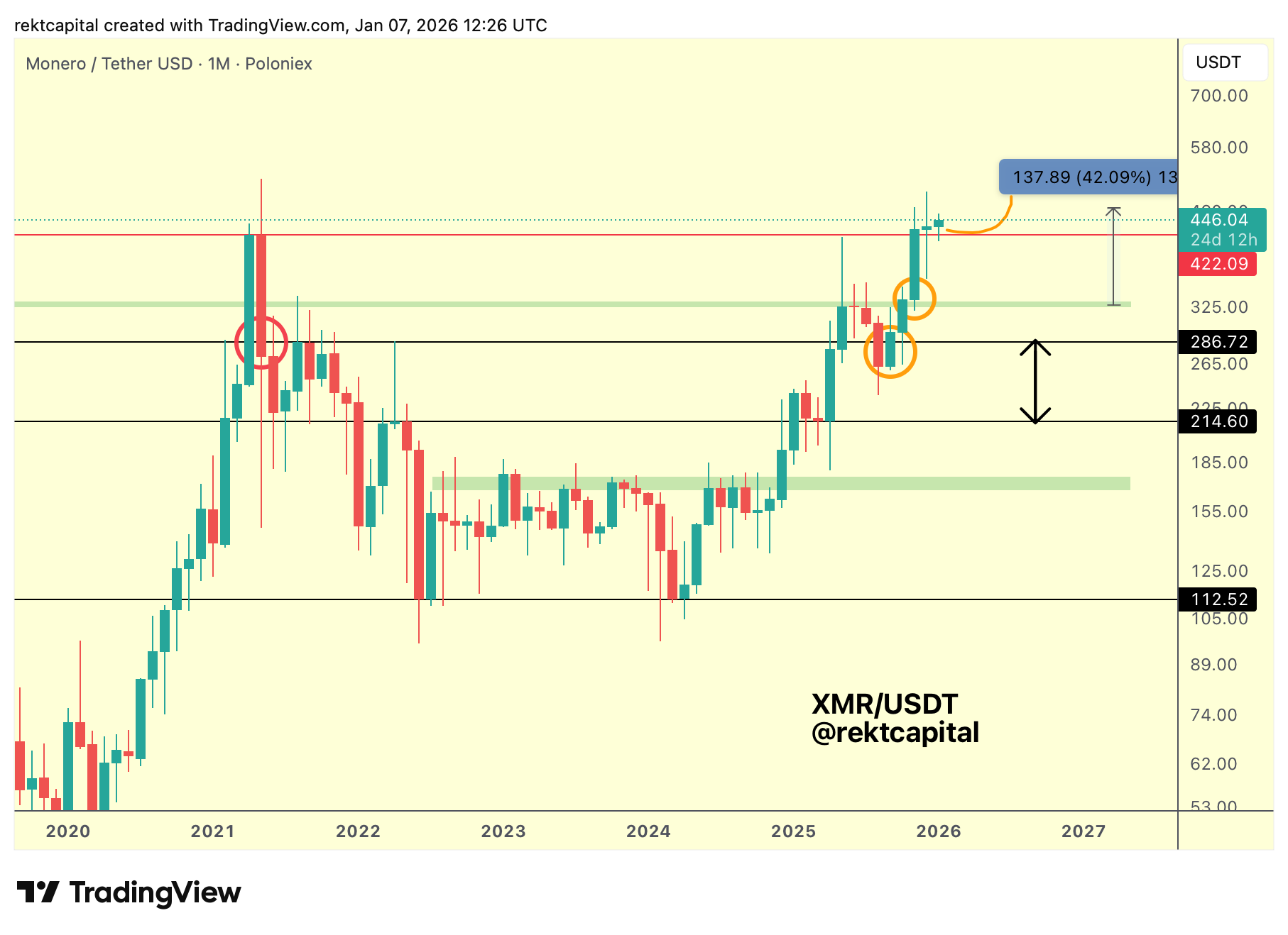 As discussed last week, XMR had been positioning for a retest of former resistance into new support, with price spending roughly three consecutive Monthly Closes holding above $422.09 (red horizontal).