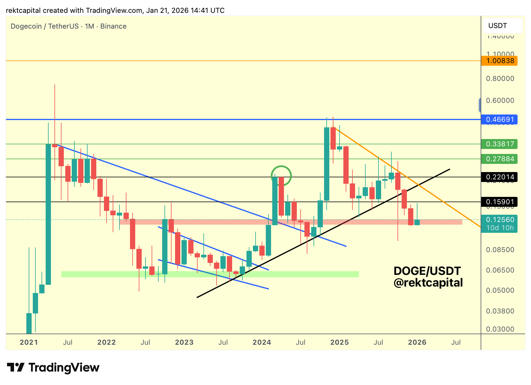 But those moves occurred without a proper reclaim, instead rebounding from the multi-year uptrend rather than establishing $0.12 as a durable base.
