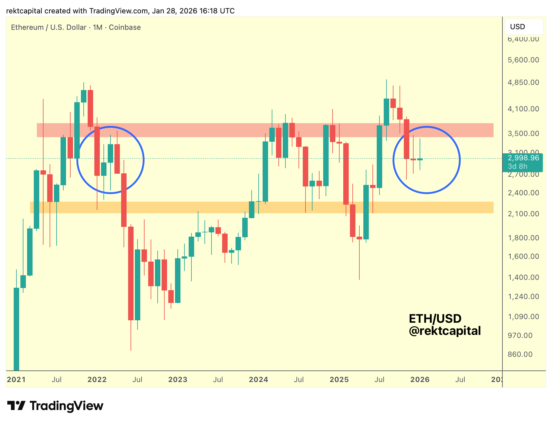 Ethereum has dropped into the low $2000s into the orange/green region, having confirmed the red resistance as a point of rejection for yet another time, leading to 2022-like downside.