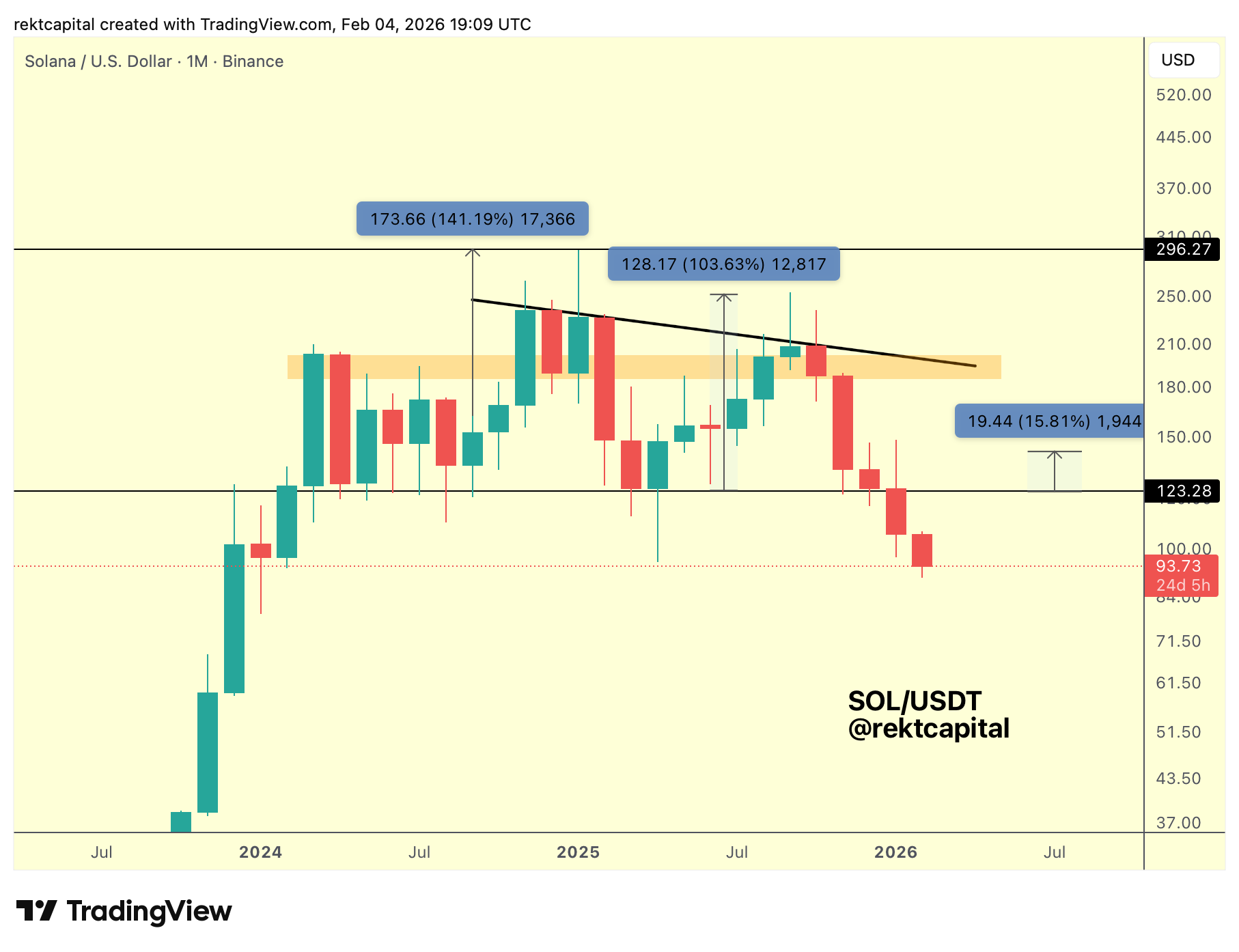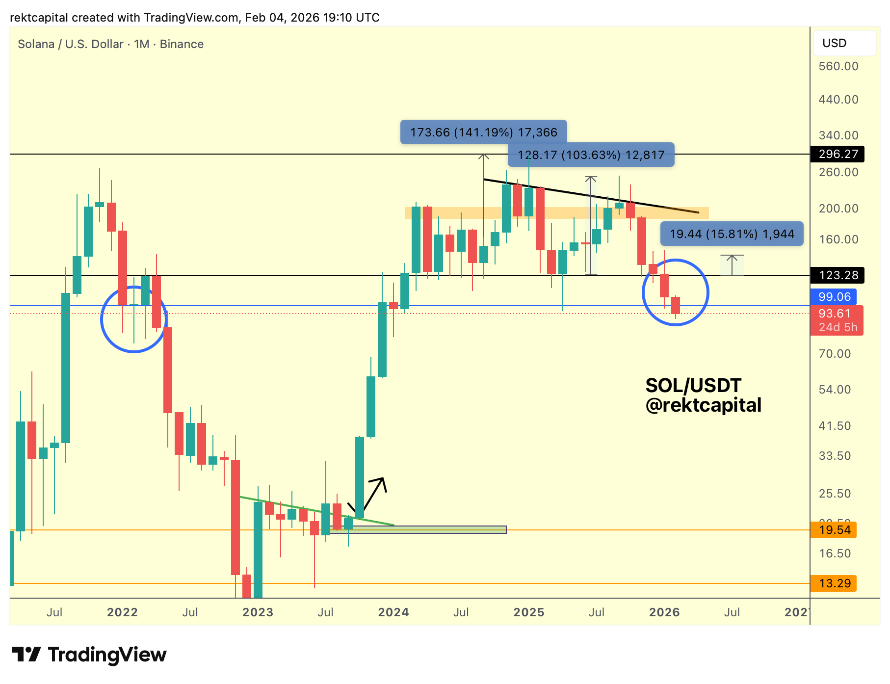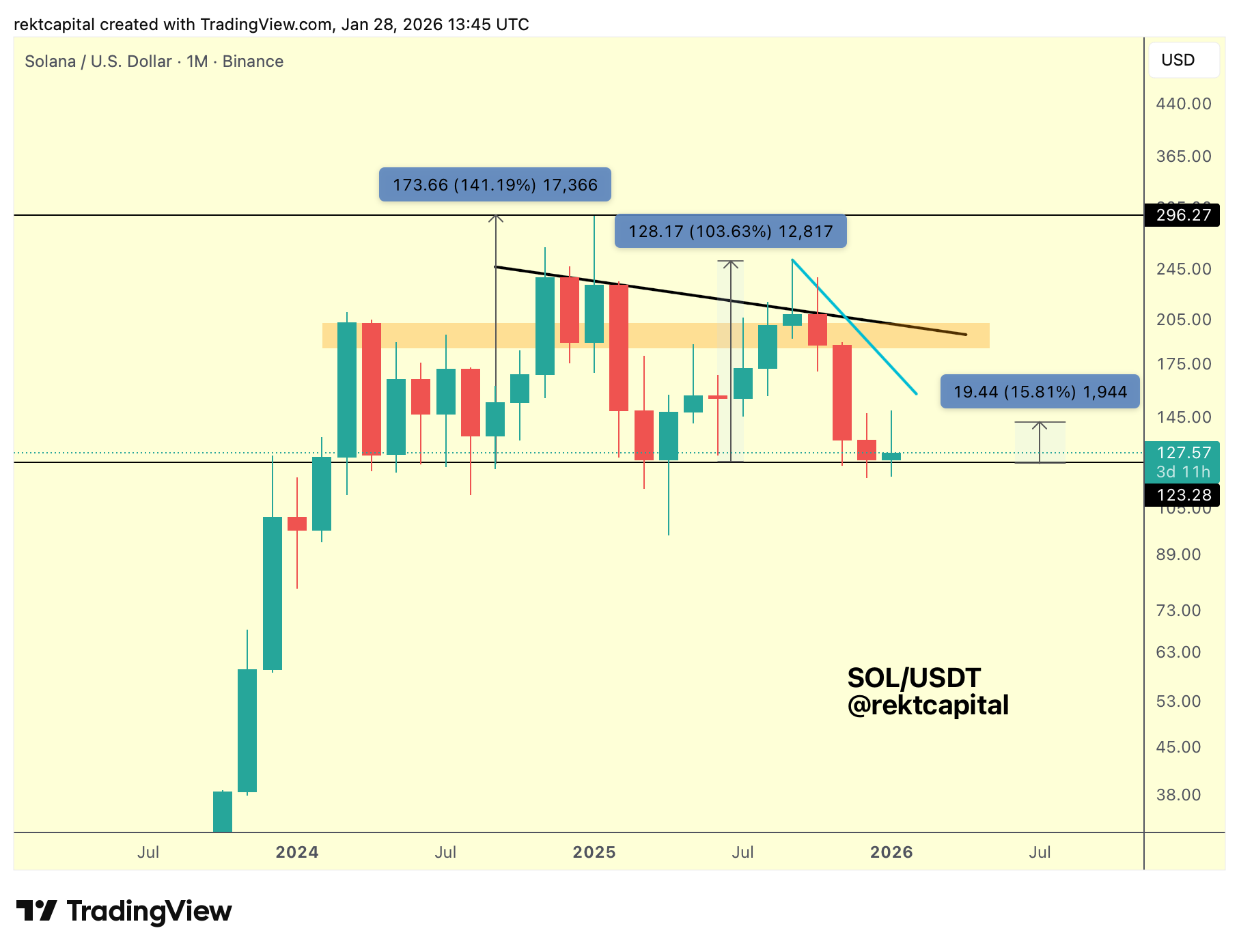 After all, in 2022 after losing $123 as support (black), SOL was able to build a brief support at around the psychological level of ~$100 ($99 to be exact, blue horizontal), violently downside wicking below it for an entire quarter and turning the $123 convqnginly into new resistance, before finally resolving itself to the downside with a Monthly Close below $99 and then performing a post-breakdown upside wicking retest to fully confirm the breakdown into accelerated downside continuation throughout the latter months of 2022.