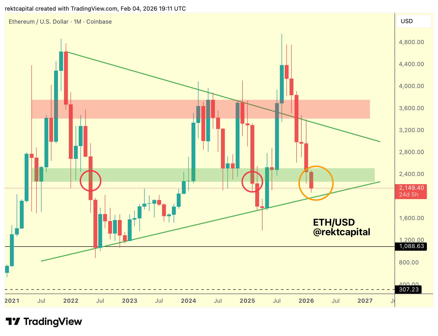 And if ETH Monthly Closes below the green box and turns it into new resistance, then price would indeed pose seller pressure on that Uptrend, to really test if there are any buyers left there.