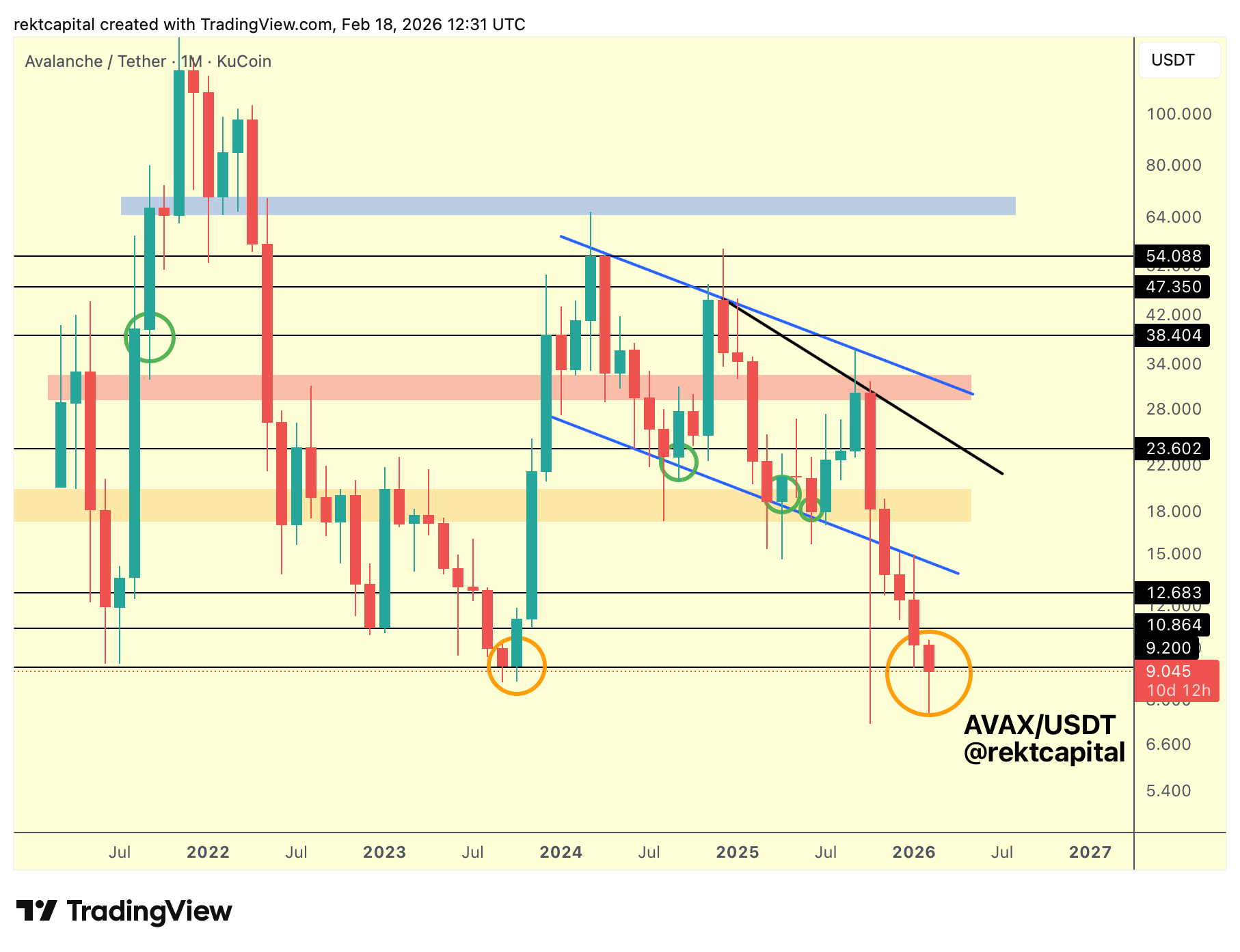 If AVAX ultimately Monthly Closes below $9.200 (black horizontal, former All Time Low support), then a bearish retest would likely follow.
