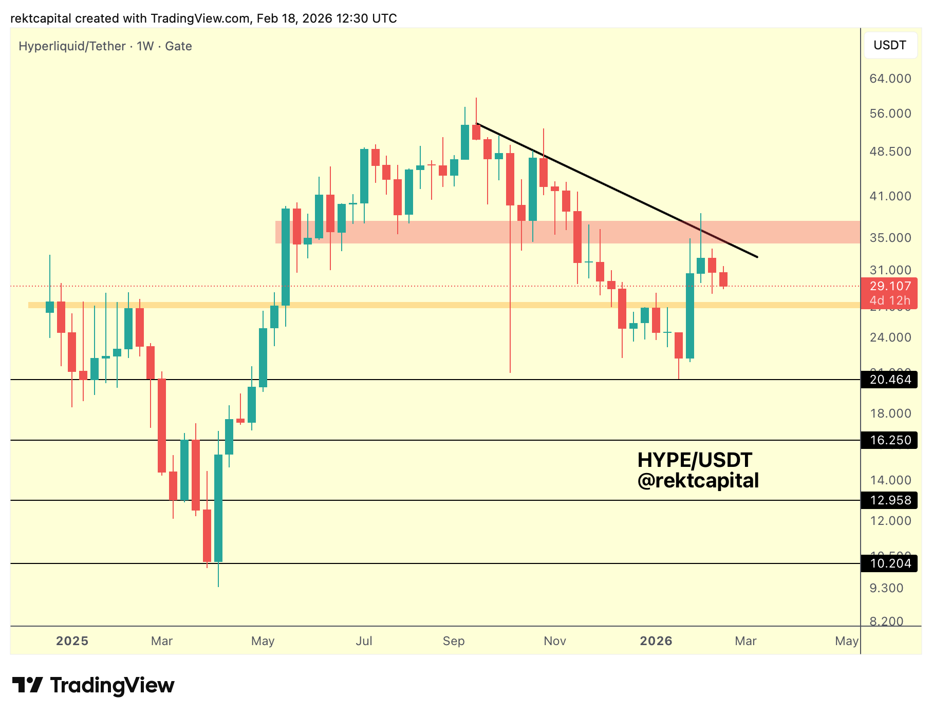HYPE developed a rounding, topping macro structure, which it fully broke down from, confirming downside continuation into a multi-month downtrend.