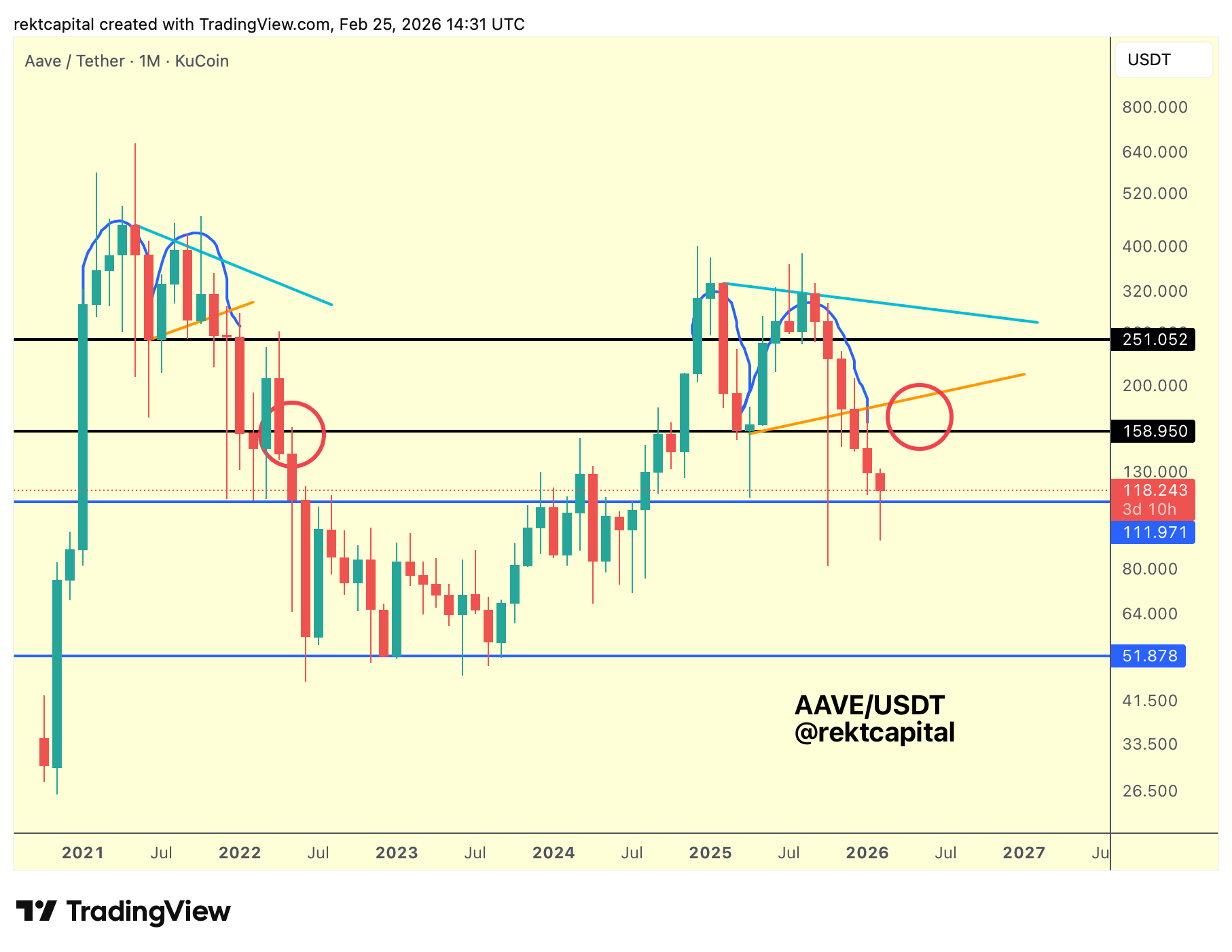 Structurally, Aave is trading within a broader $111.971–$158.950 range, and this range-bound behaviour looks increasingly probable.