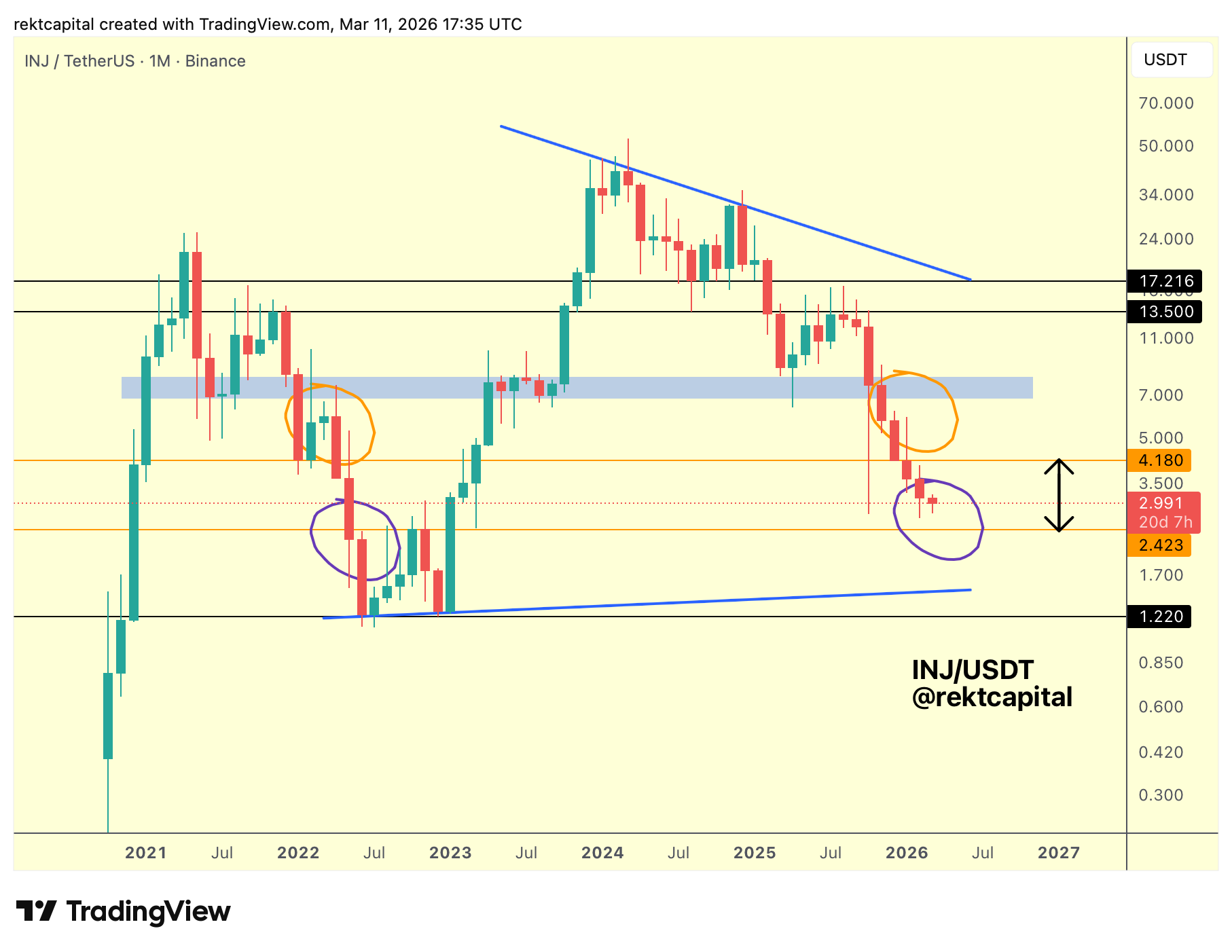 Injective is unfolding a structure that closely resembles its 2022 fractal, where a breakdown sequence developed after key levels flipped into resistance.