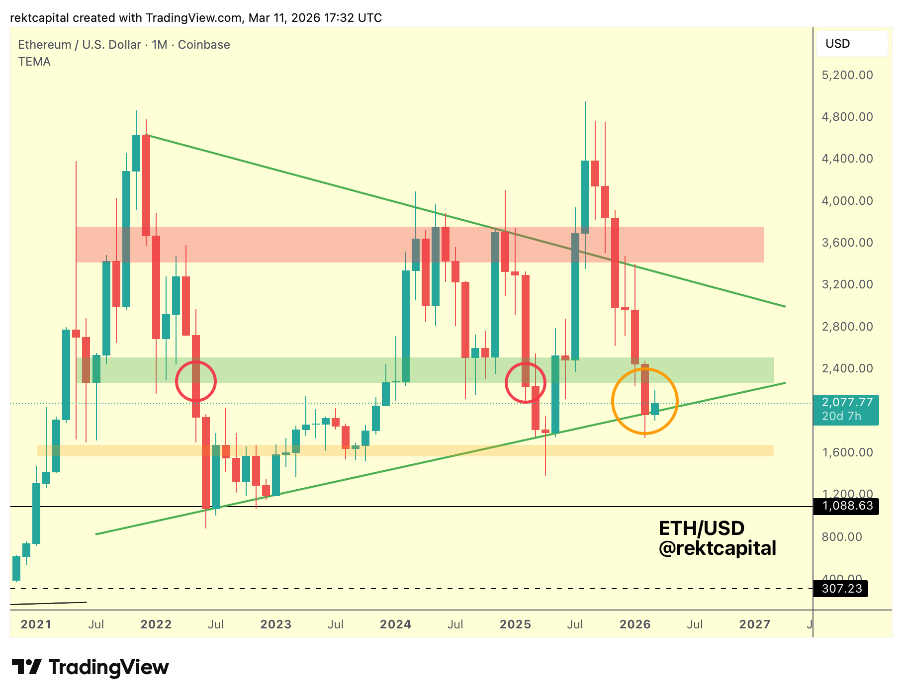 A successful reclaim could then open the door toward the green resistance region above, which has historically acted as a major pivot in Ethereum’s broader trend.