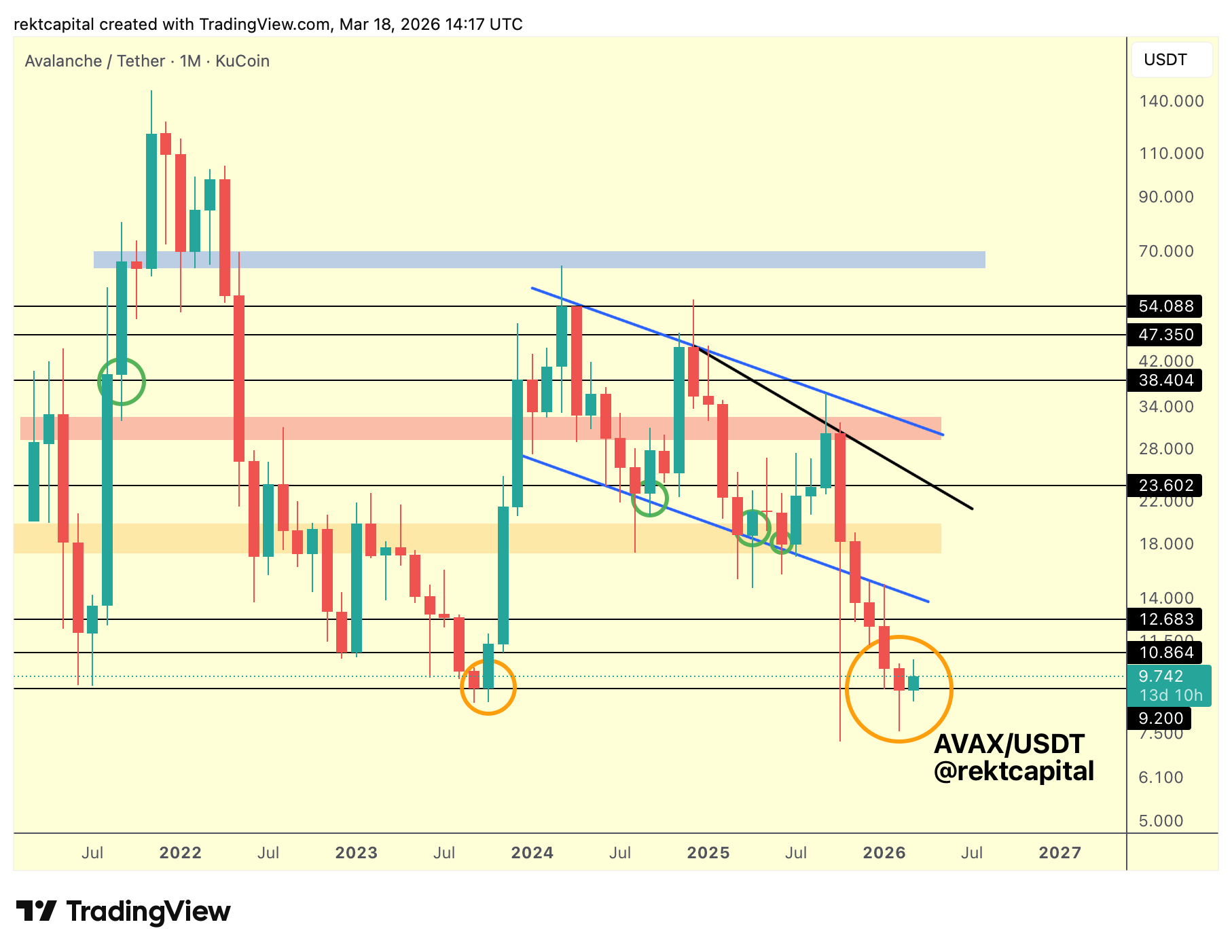 As a result, AVAX is currently trading within the $9.20–$10.864 range (black to black, Weekly range), moving between range low and range high without expansion.