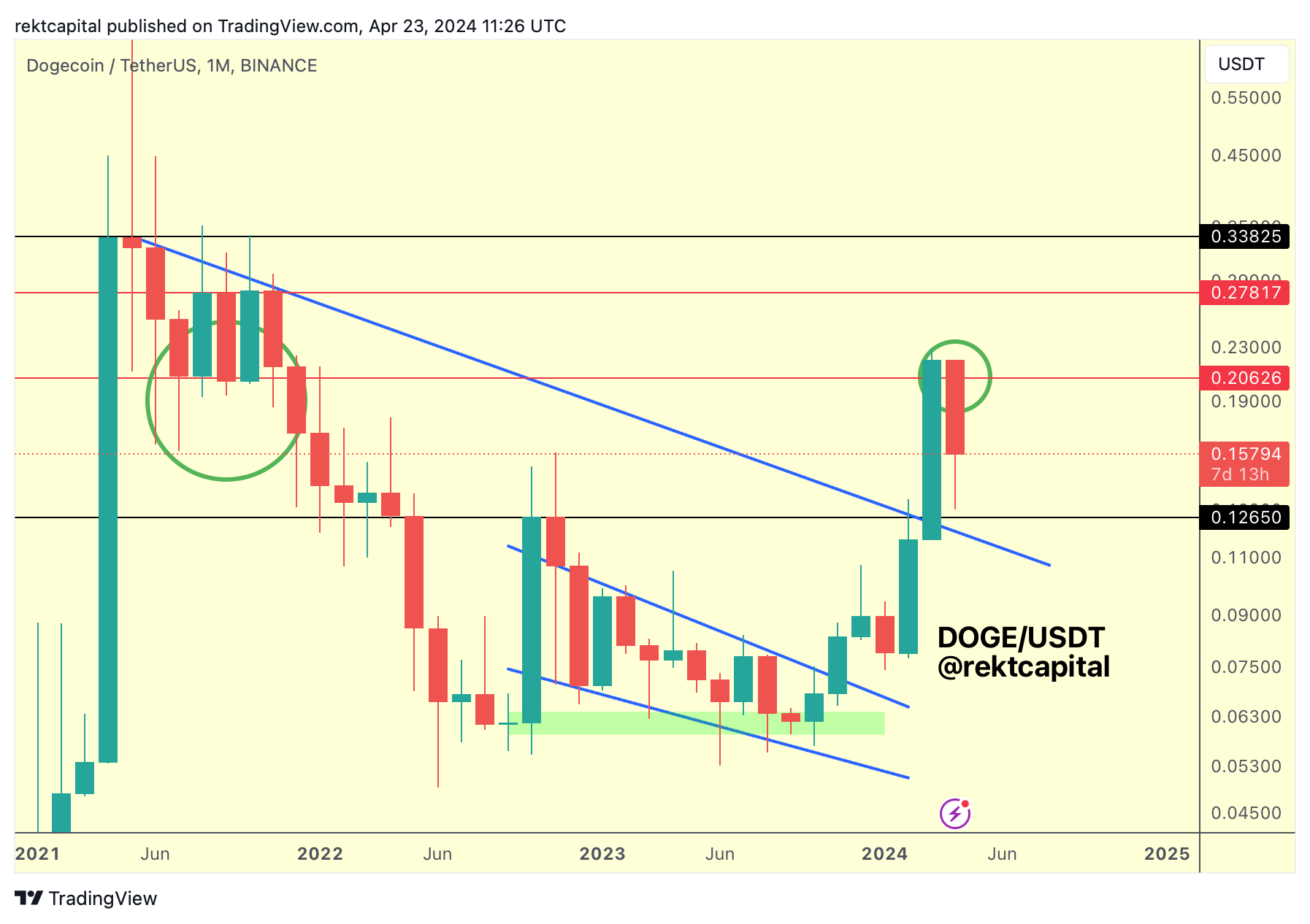 We know that DOGE has failed its Monthly retest of the red $0.20 level and dropped back down into a confluent support area that is the Range Low of $0.12 and the Macro Downtrend that price broke out from last month.