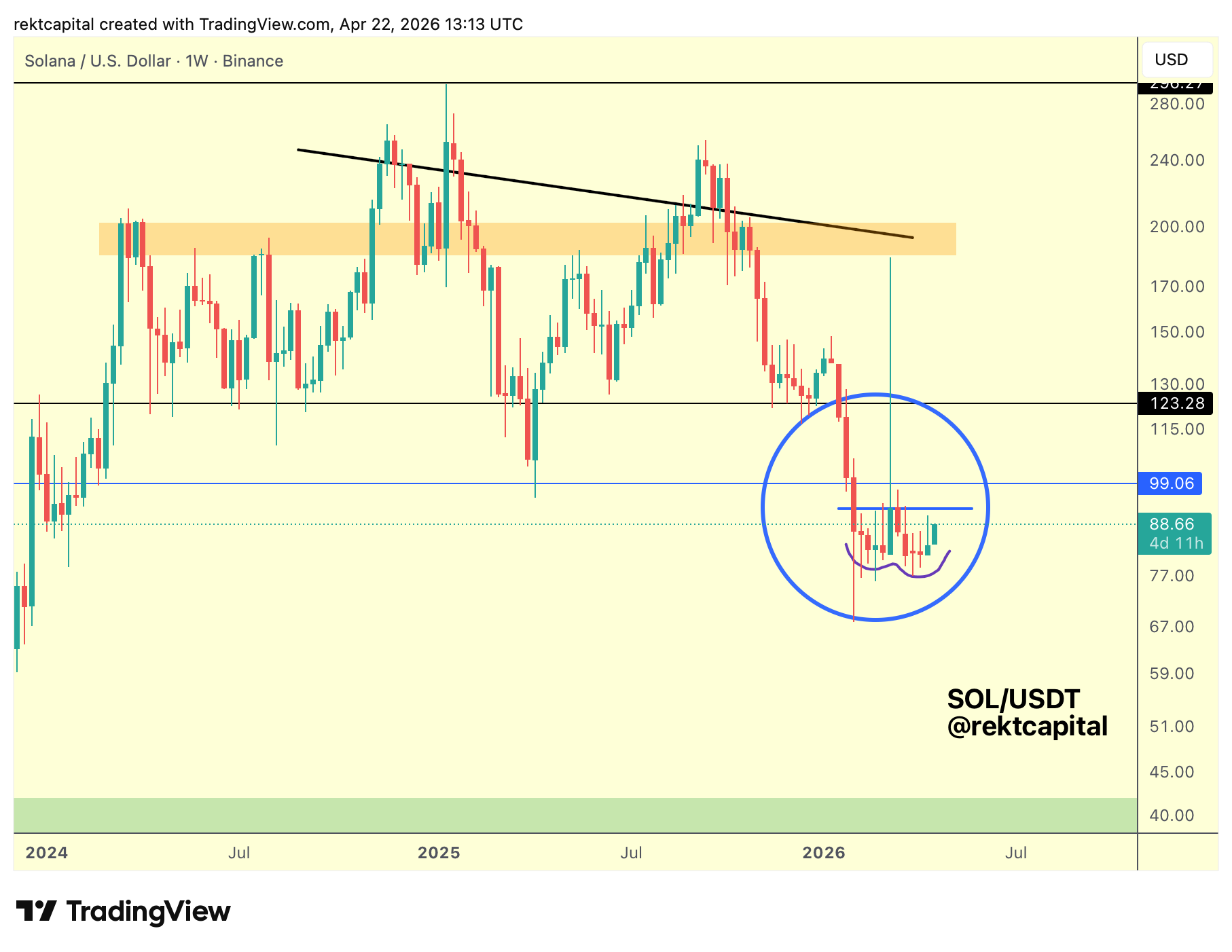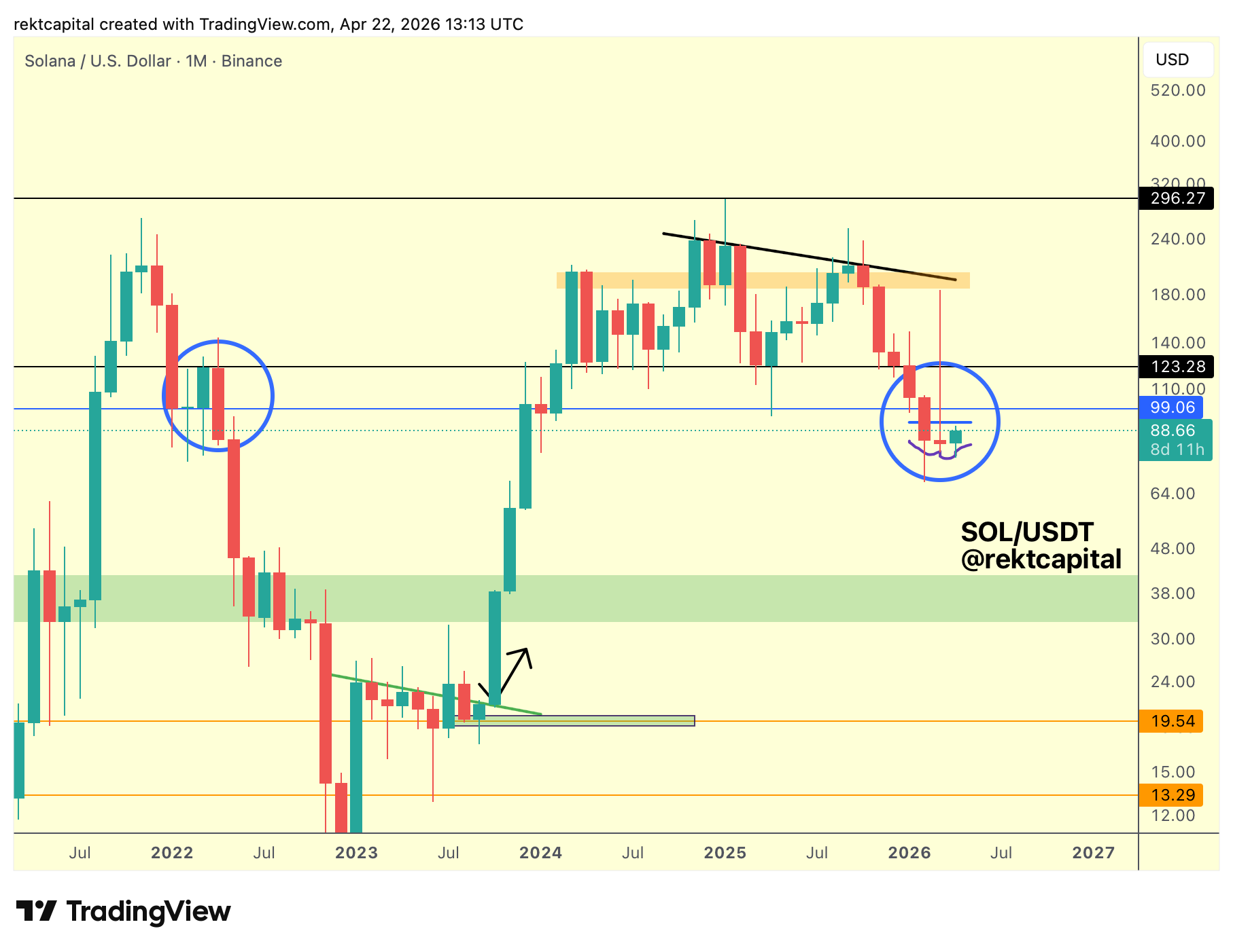 For a year and a half, Solana held $123.28 as support, with downside wicks dipping into the $99.06 liquidity pool across that extended period, a pattern highly reminiscent of 2022.