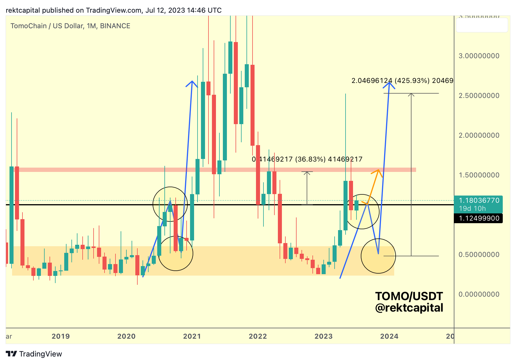 That being said however, last month we saw volatile consolidation between the black Range Low support and the red Range High resistance; and if TOMO is able to reclaim the black Range Low as support once again, it could follow the orange path to revisit the red Range High resistance above.