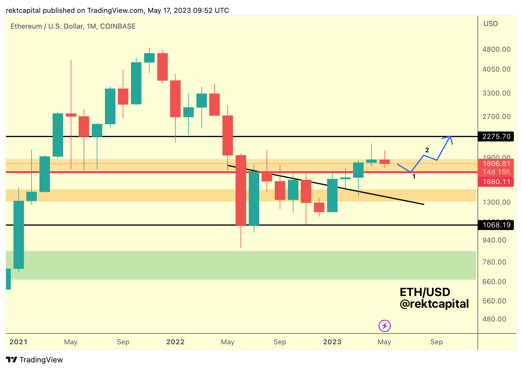 Technically yes, but ETH hasn’t been able to reclaim the top of the orange box as support for the past two months so there’s certainly scope for a small reset to the red level below.