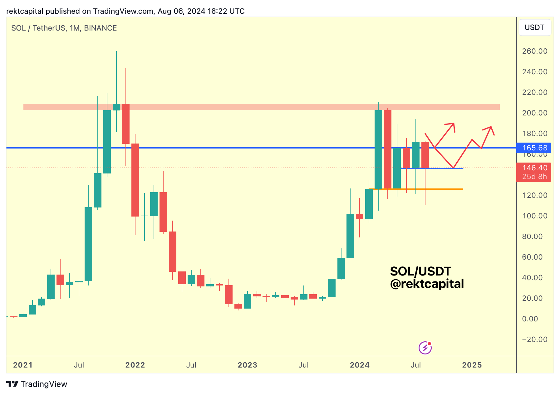 This month's downside wick saw SOL dip all the way to the next major Monthly support at ~$120 (orange) which has been holding as support for almost 6-months now.