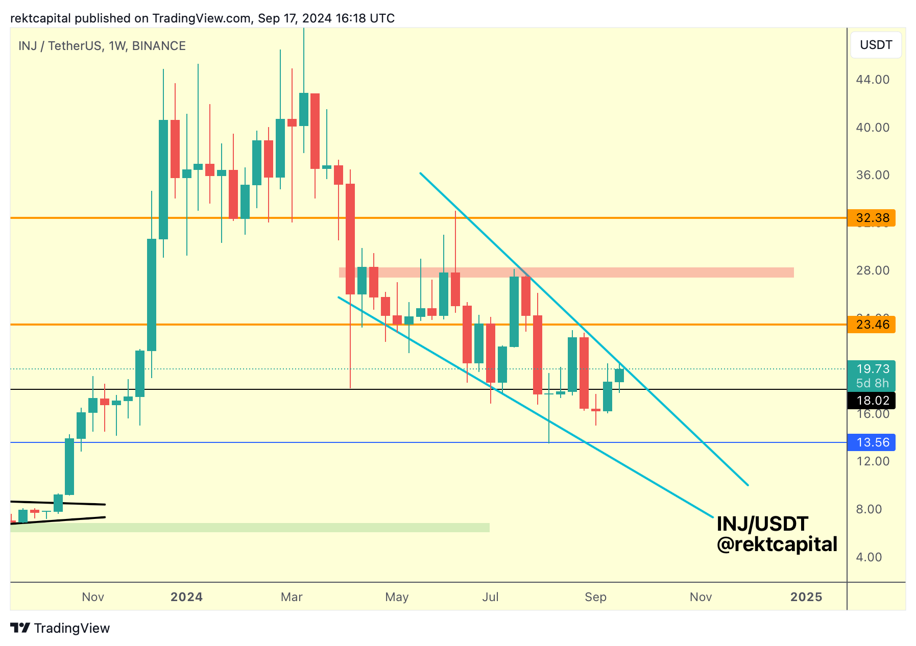 INJ would need to Weekly Close above the top of this pattern to kickstart a new uptrend after a multi-month downtrend and dwindling within this downtrending channel.