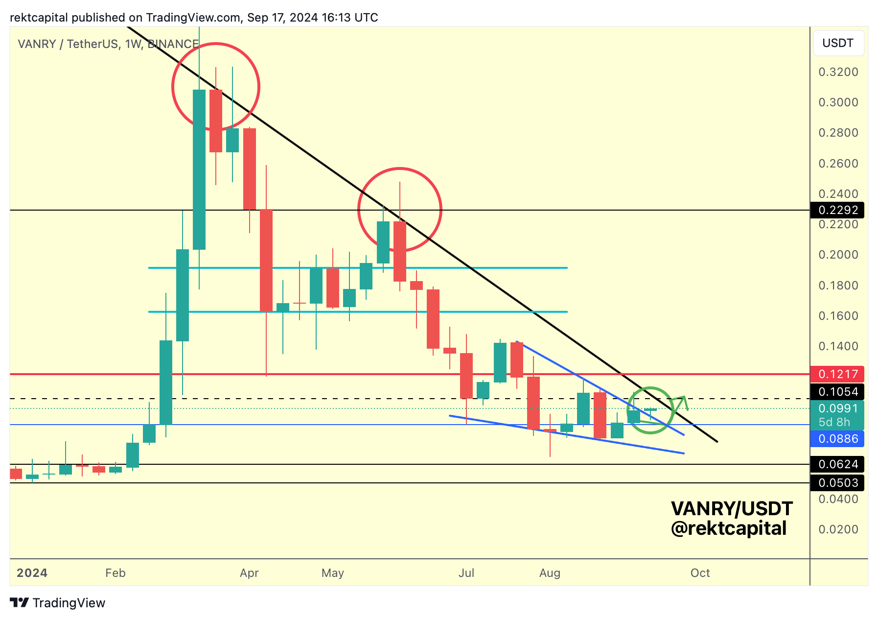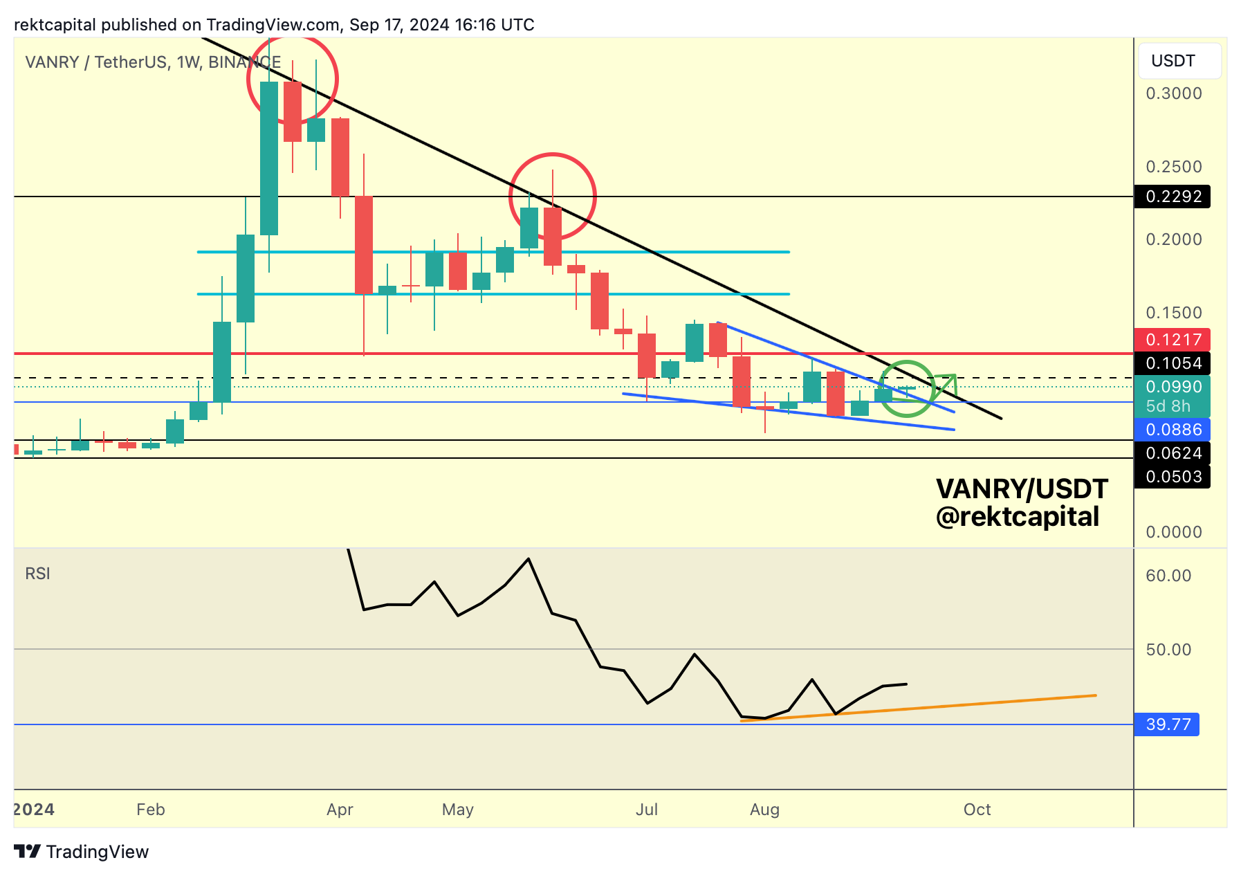In recent weeks, we discussed VANRY and its Falling Wedge-like structure and how it needed to retest the blue level of $0.088 as support to follow through on its green path: