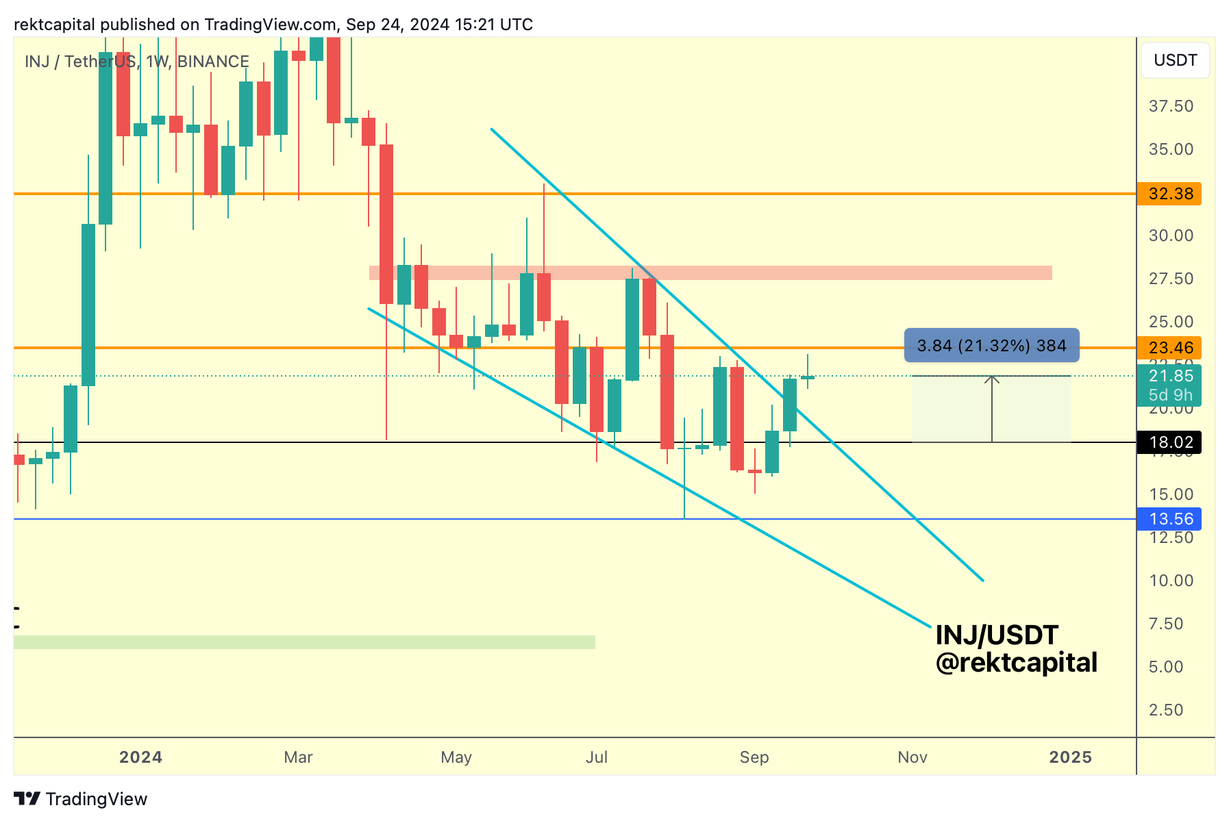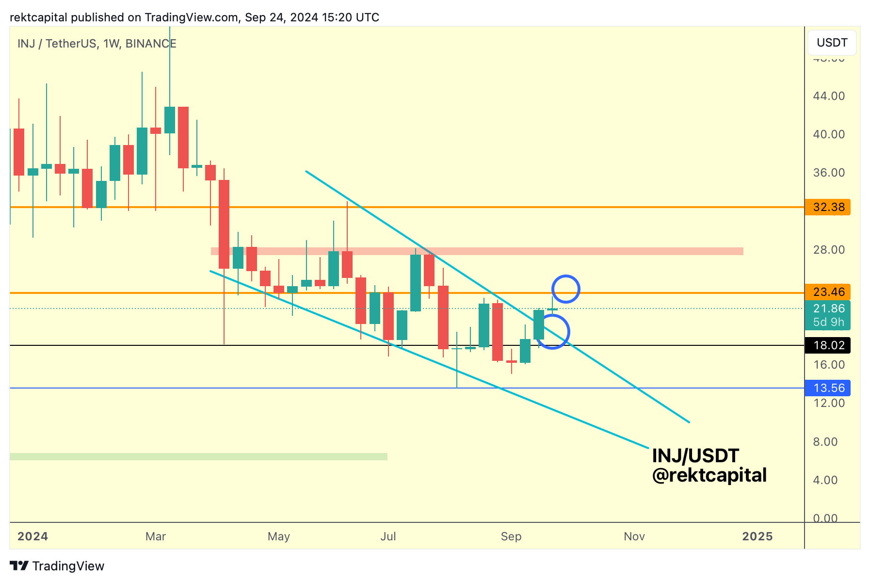 For INJ to enjoy trend continuation towards the red boxed resistance at around $27.50, it would need to Weekly Close above the orange Range High first.