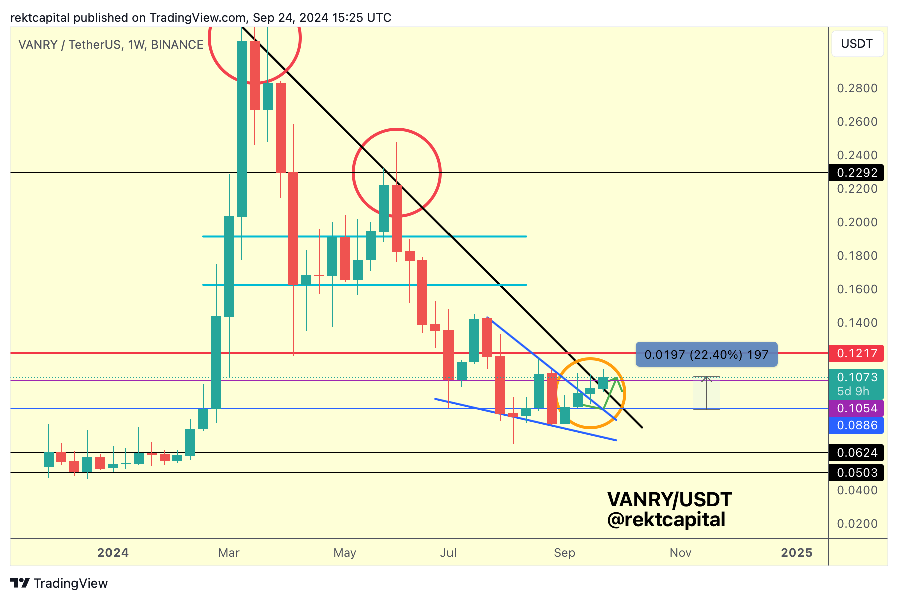 Over the past few weeks, we discussed VANRY and its Falling Wedge-like structure and how it needed to retest the blue level of $0.088 as support to follow through on its green path: