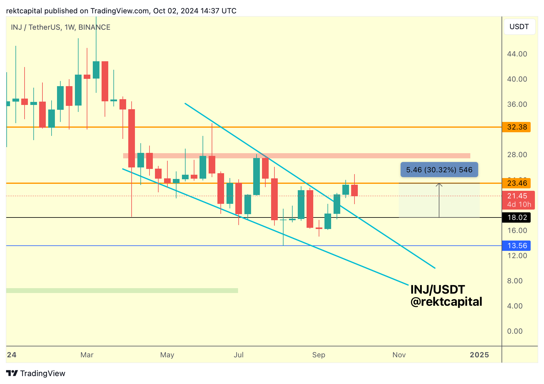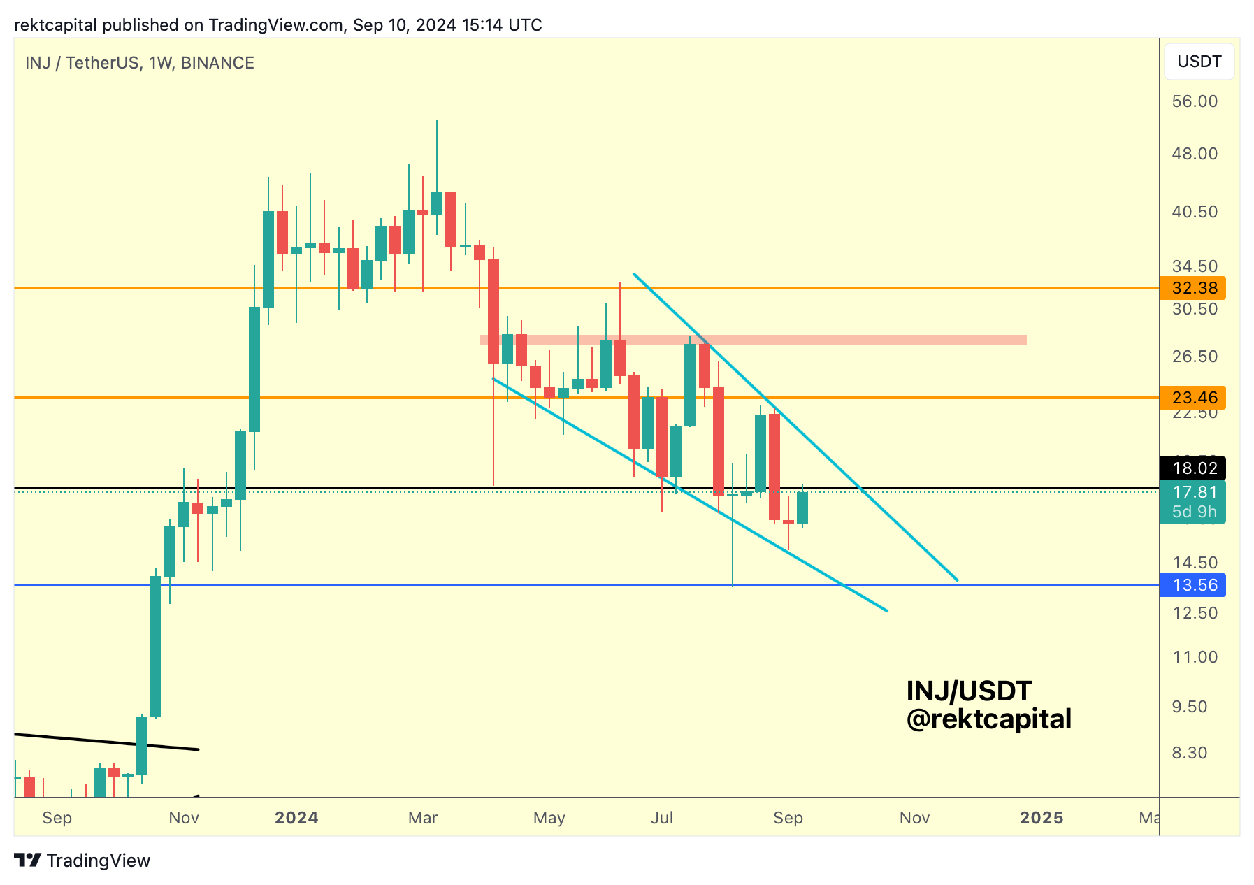 For INJ to continue higher, it would need to reclaim the Range High as support via a Weekly Close above it followed by a retest of it into new support.