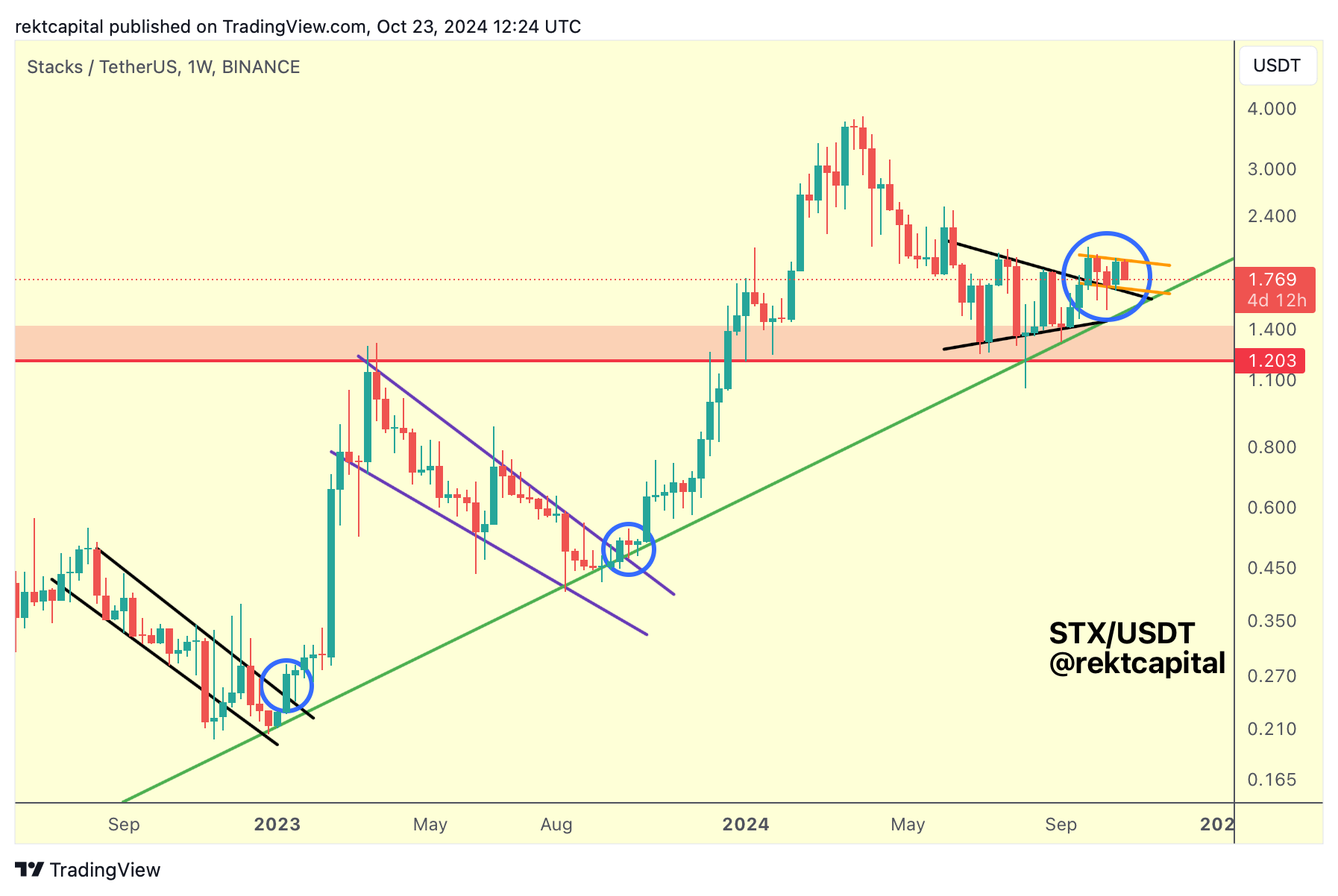 STX is still successfully retesting the top of the macro pattern (black) as support, likely forming a multi-week re-accumulation structure on top of that aforementioned pattern.