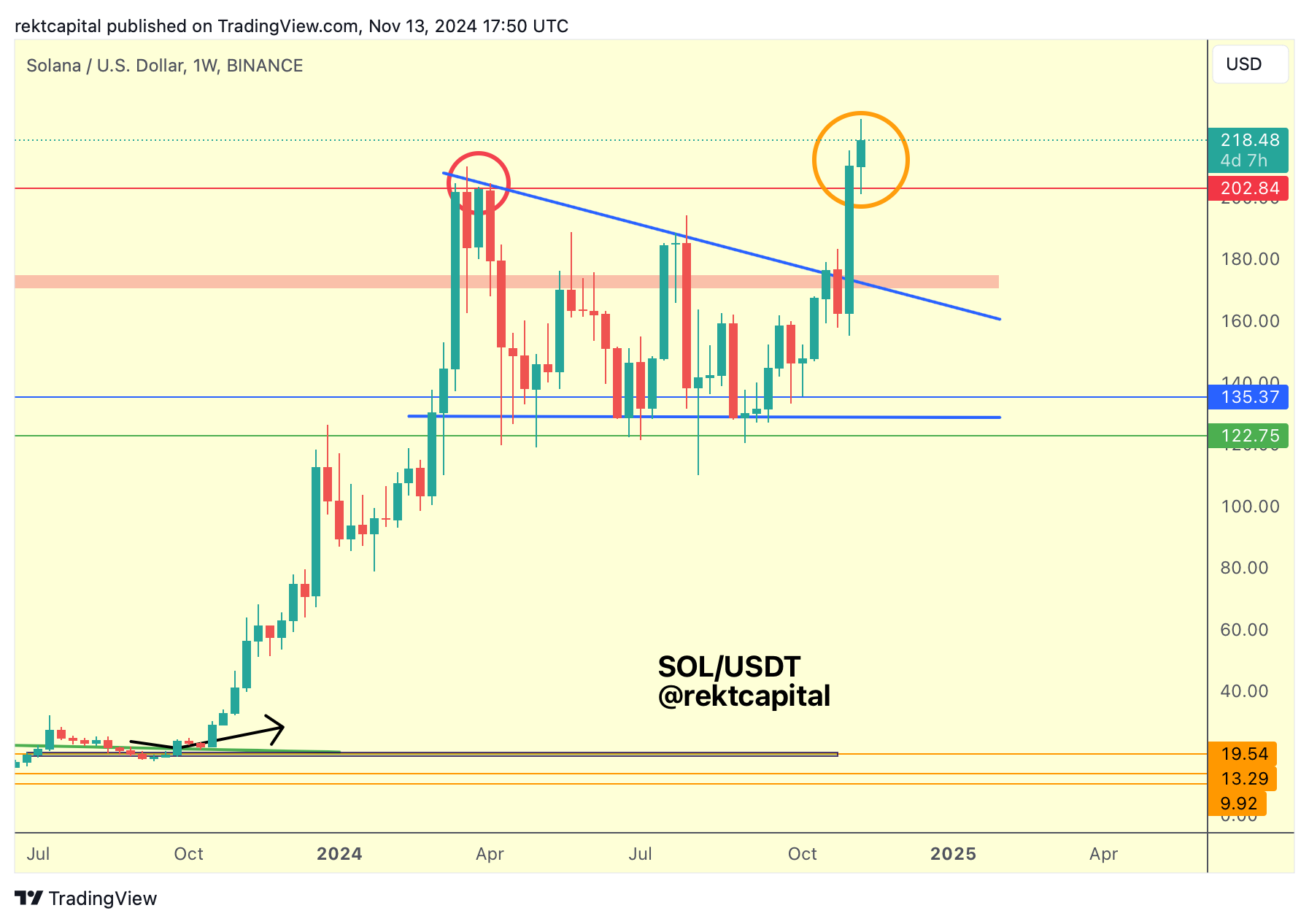 Solana is currently performing a bullish Weekly Close above a previous crucial resistance:
