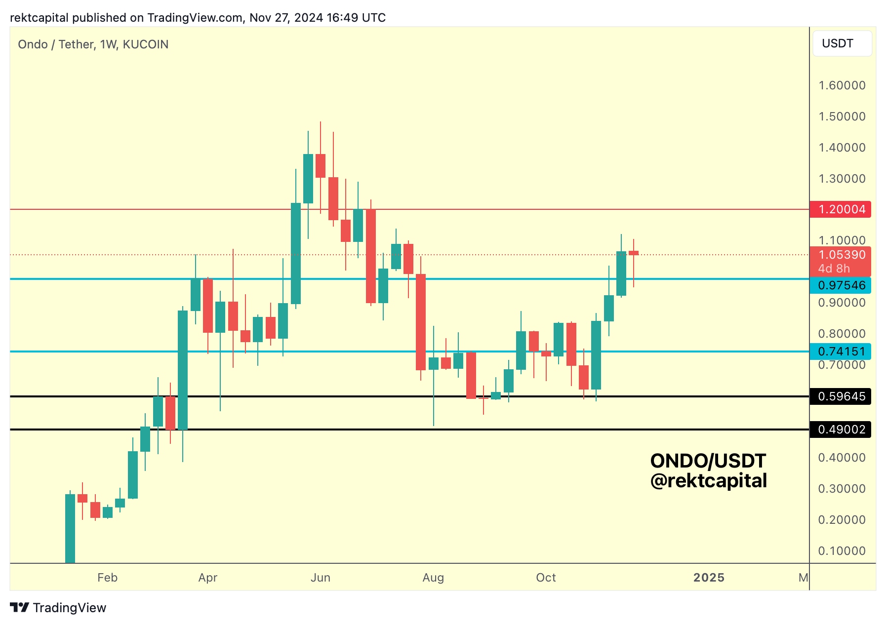 ONDO is very similar to RENDER in the sense that price has Weekly Close above an old resistance (light blue, $0.97) and is now in the process of turning it into new support.