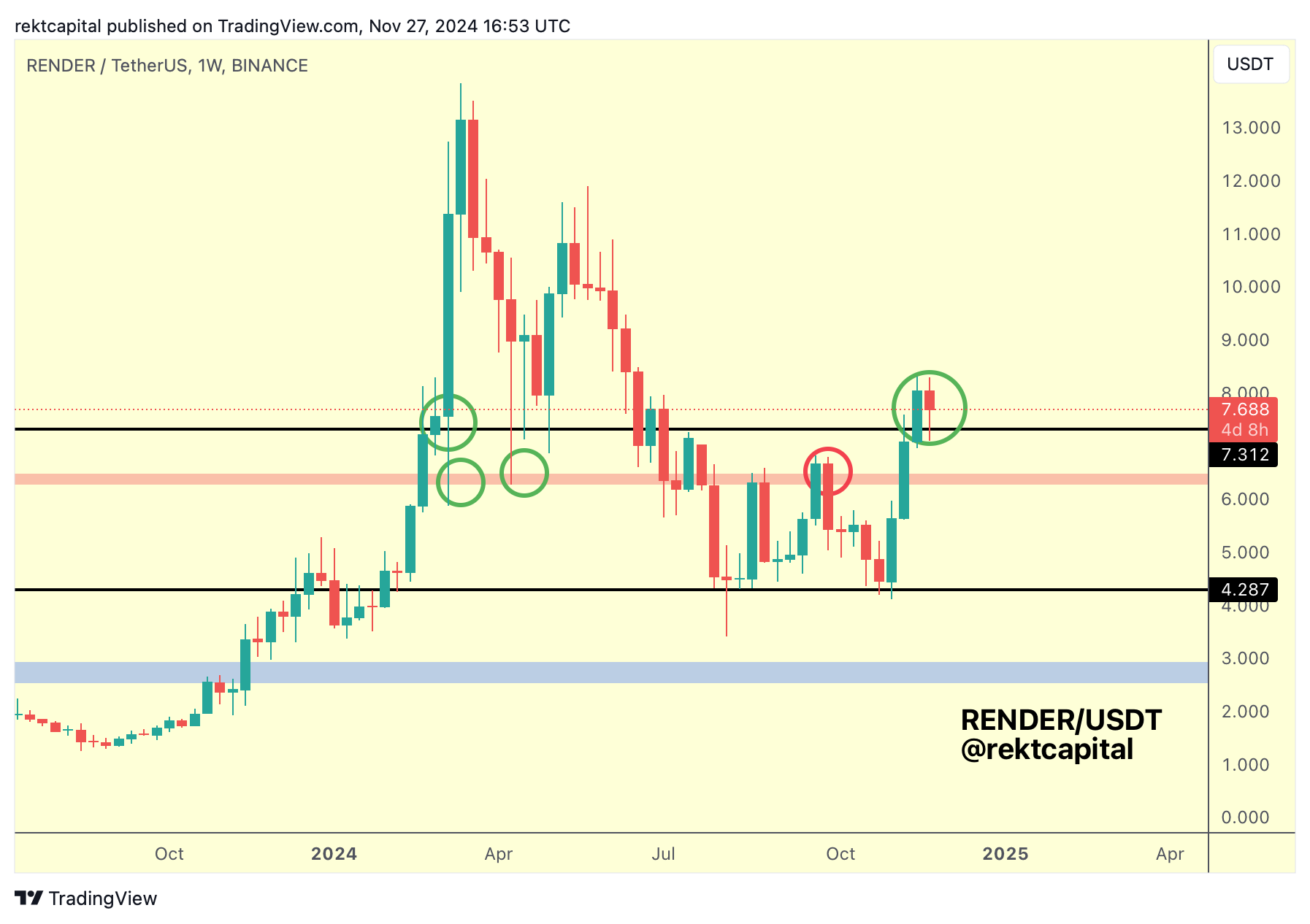 Because the last time RENDER Weekly Closed above the black $7.31 level and subsequently retested it as support, price rallied to new All Time Highs.
