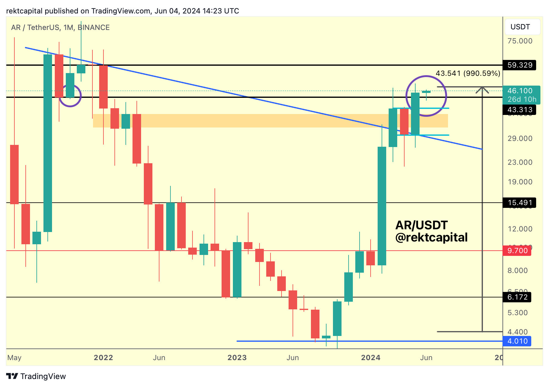 - Enabled a Monthly Close above the black $43 level to begin a break back into the $43-$59 range.