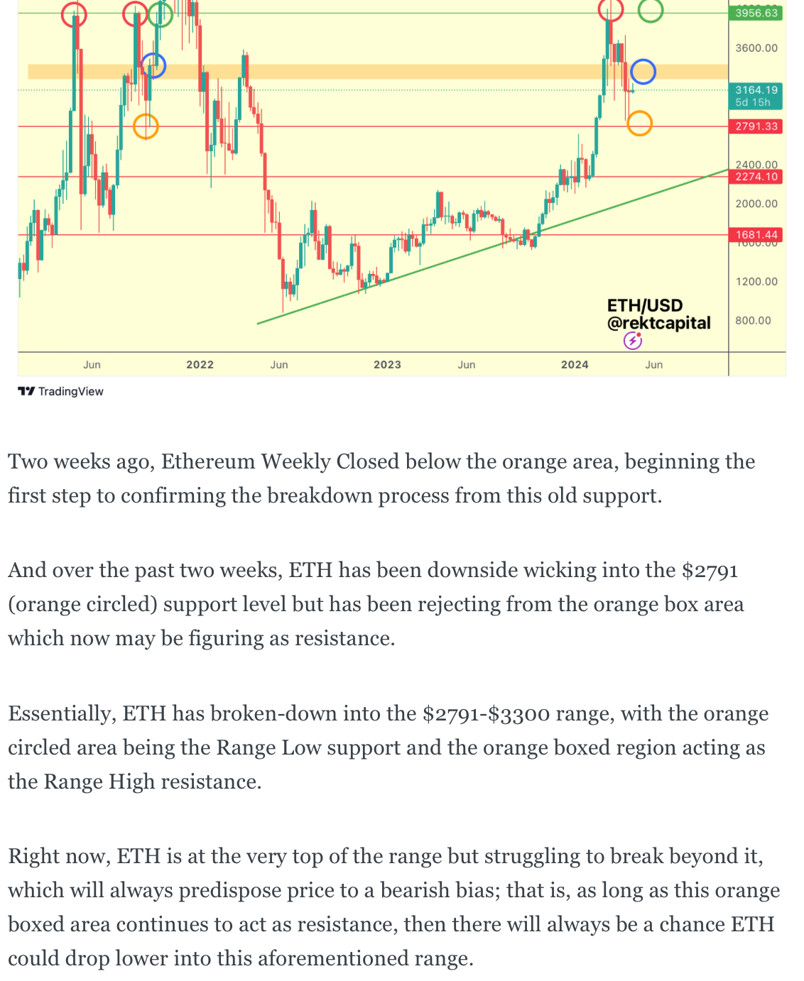 Over the past few weeks, we've covered ETH in a lot of detail, first talking above how a potential rejection from the blue circled area could see price drop into the orange circled level: