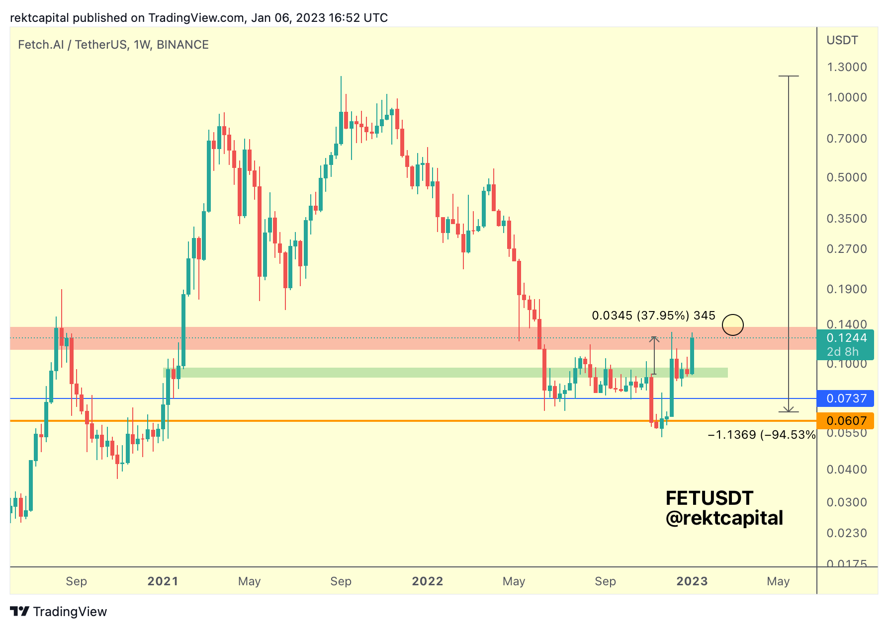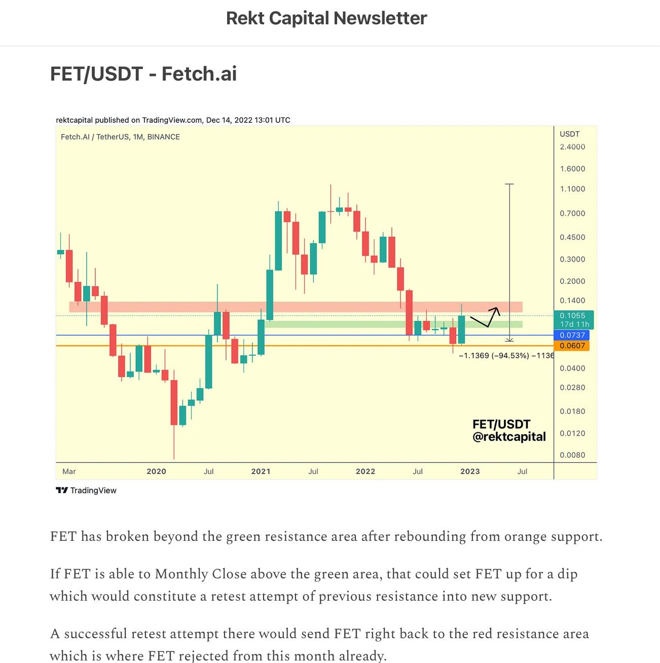In the absence of such a Weekly Close however, it’s likely FET would need to drop into the green area again for a retest attempt.