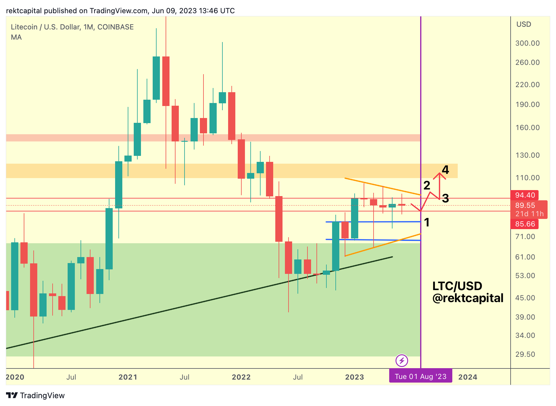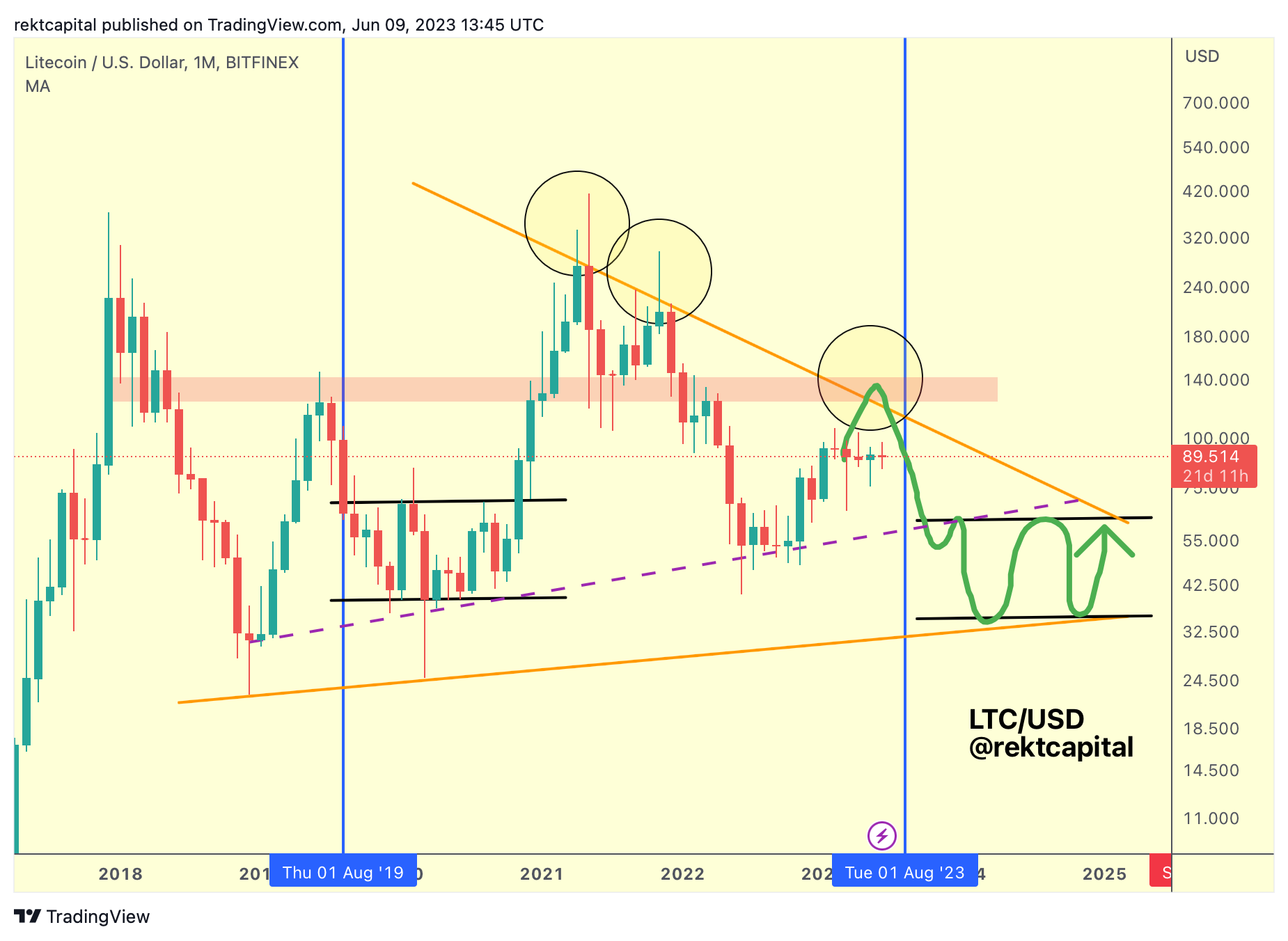 LTC has been consolidating within this red-red range for months, despite downside and upside wicking throughout.