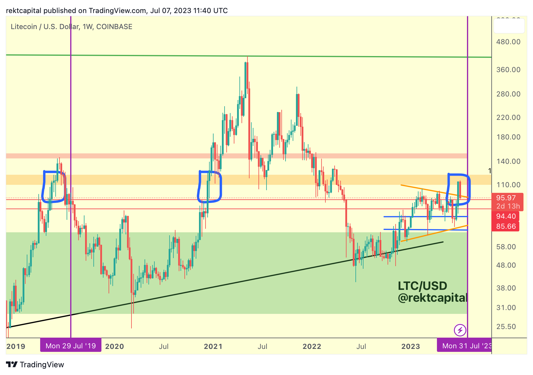 In the past (even in prior to the 2019 LTC Halving), LTC performed downside volatility to the ~$94/$96 level, before rebounding back into the orange resistance area (around $110) and Weekly Closing inside that region to confirm said region into new support.