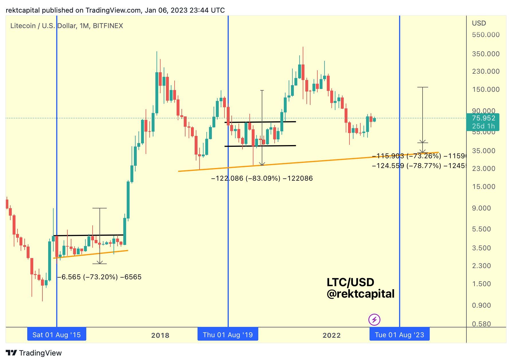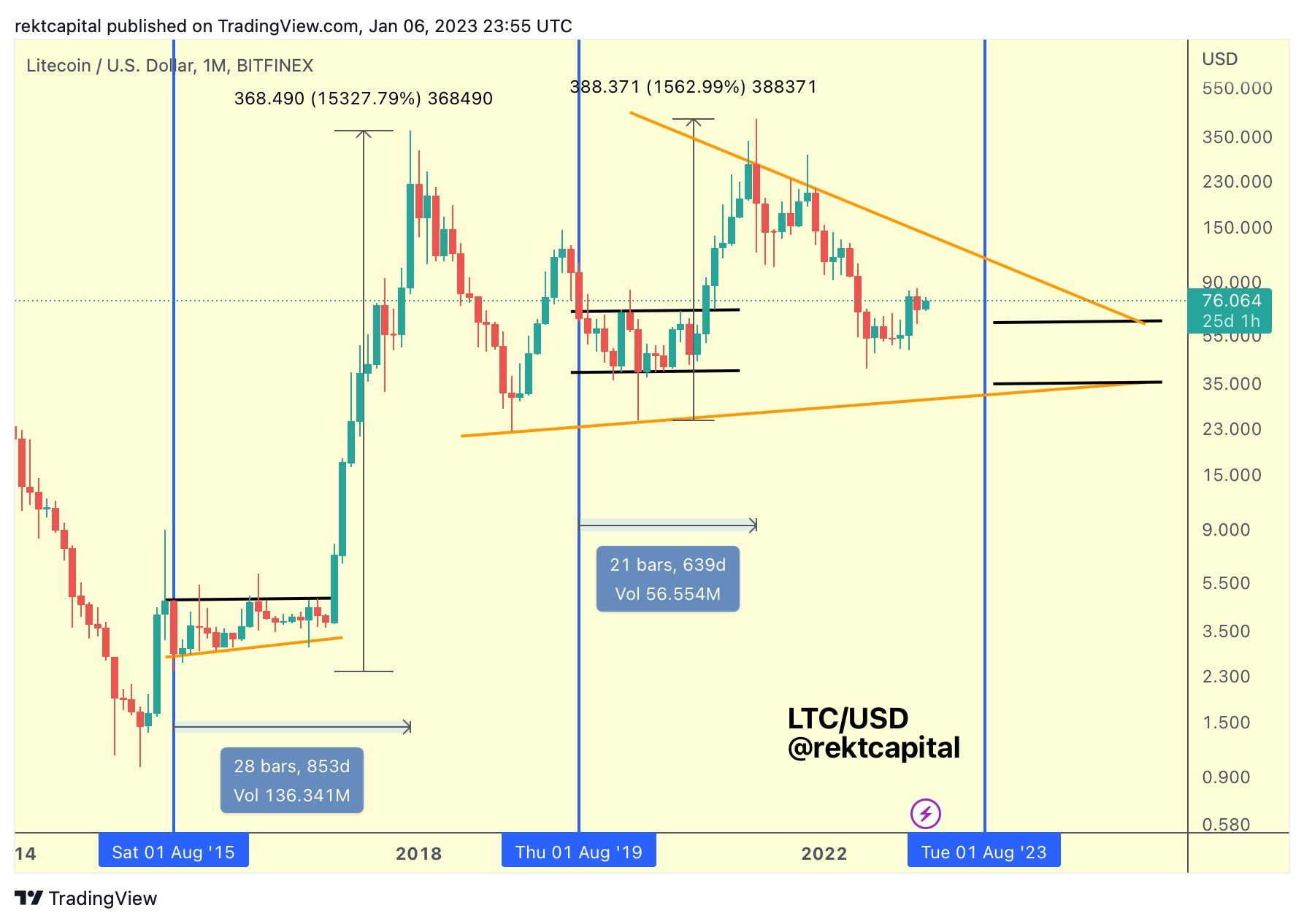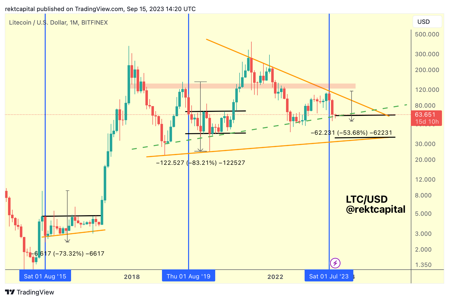 As a preface to today's analysis, here is a LTC chart I shared earlier this year as part of my Litecoin thread on X: