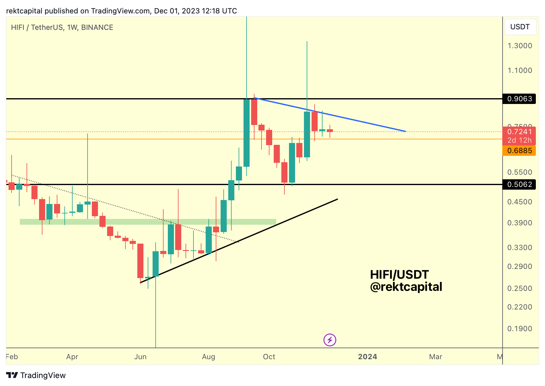 Then in October, HIFI successfully retested the black $0.50 level again, solidifying it as a Range Low and this retest enabled a revisit of the black Range High resistance at $0.90.