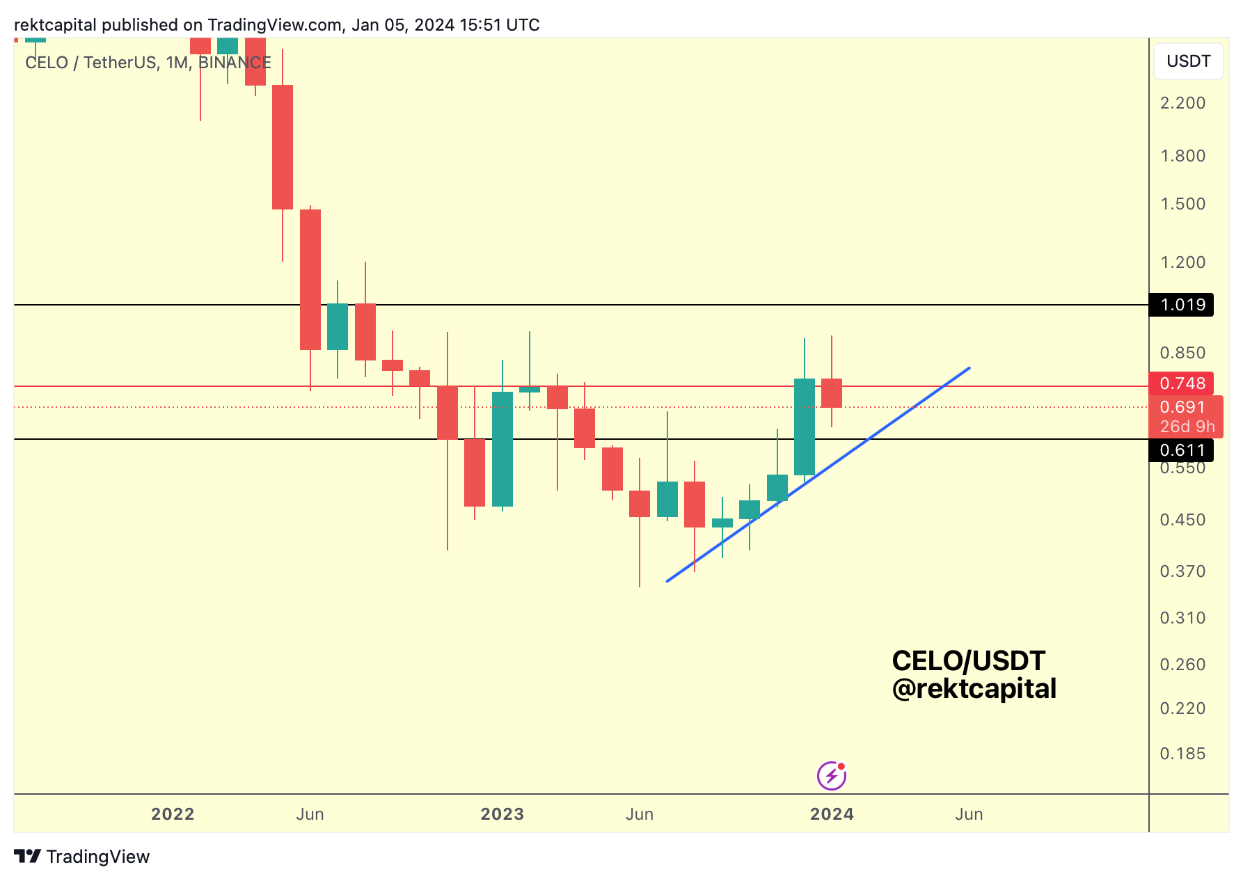 CELO broke the black resistance and Monthly Closed above the red resistance as well (i.e. a point of rejection in early 2023).