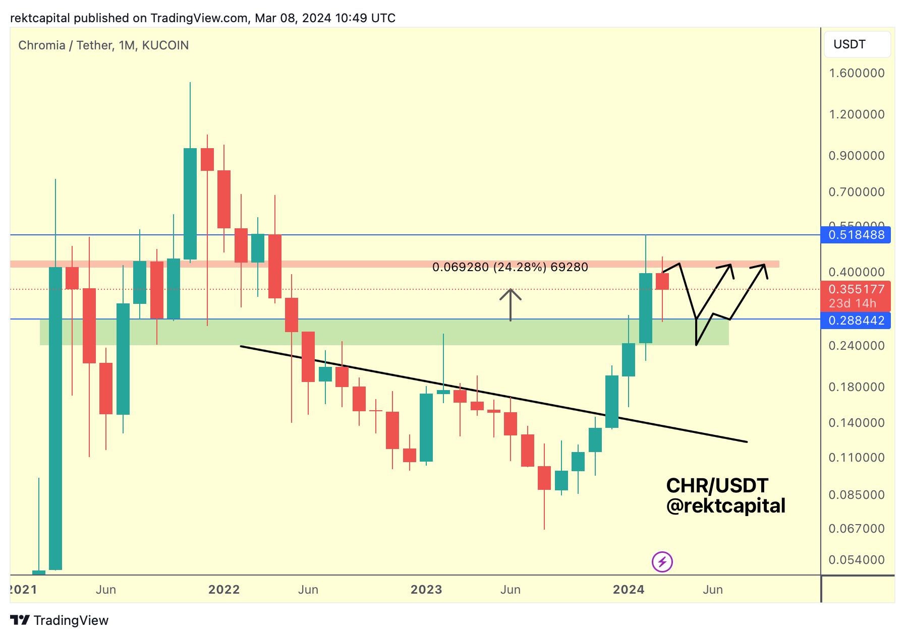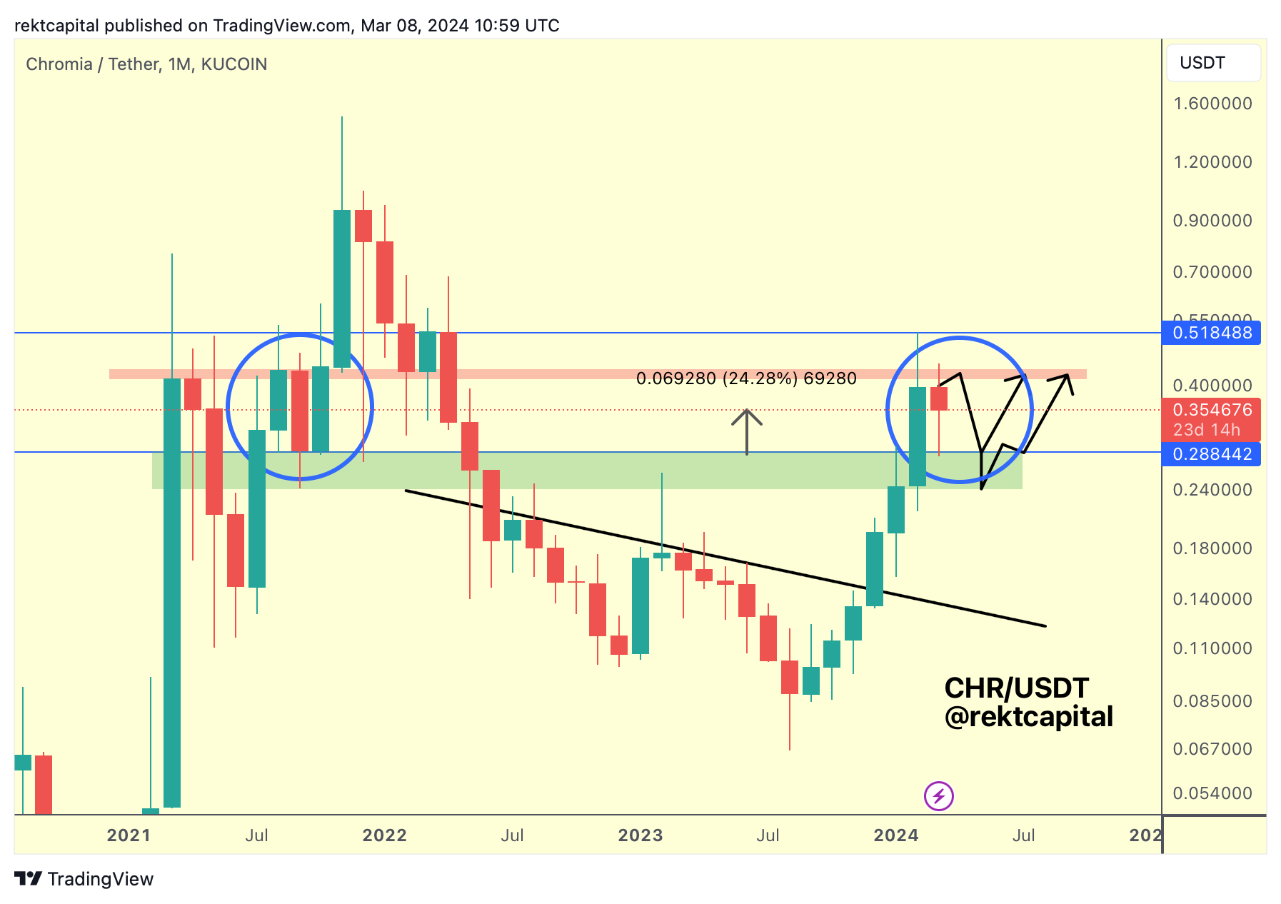 However, if CHR presents another opportunity to drop into the Range Low or even downside wick below it, it still would be satisfying the same technical conditions: that CHR is building a range here between $0.28 (blue) and ~$0.42 (red resistance).