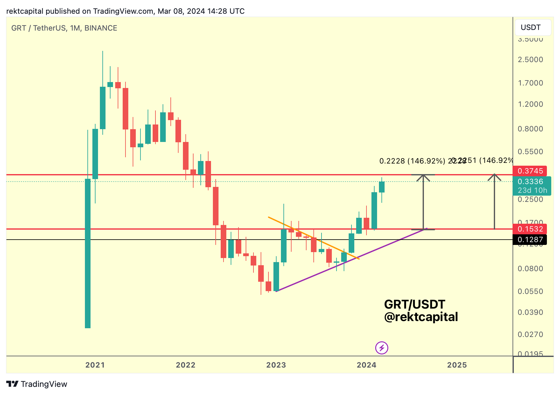 Technically, that's the entire move completed; for anything extra, GRT would need to reclaim the Range High as new support.